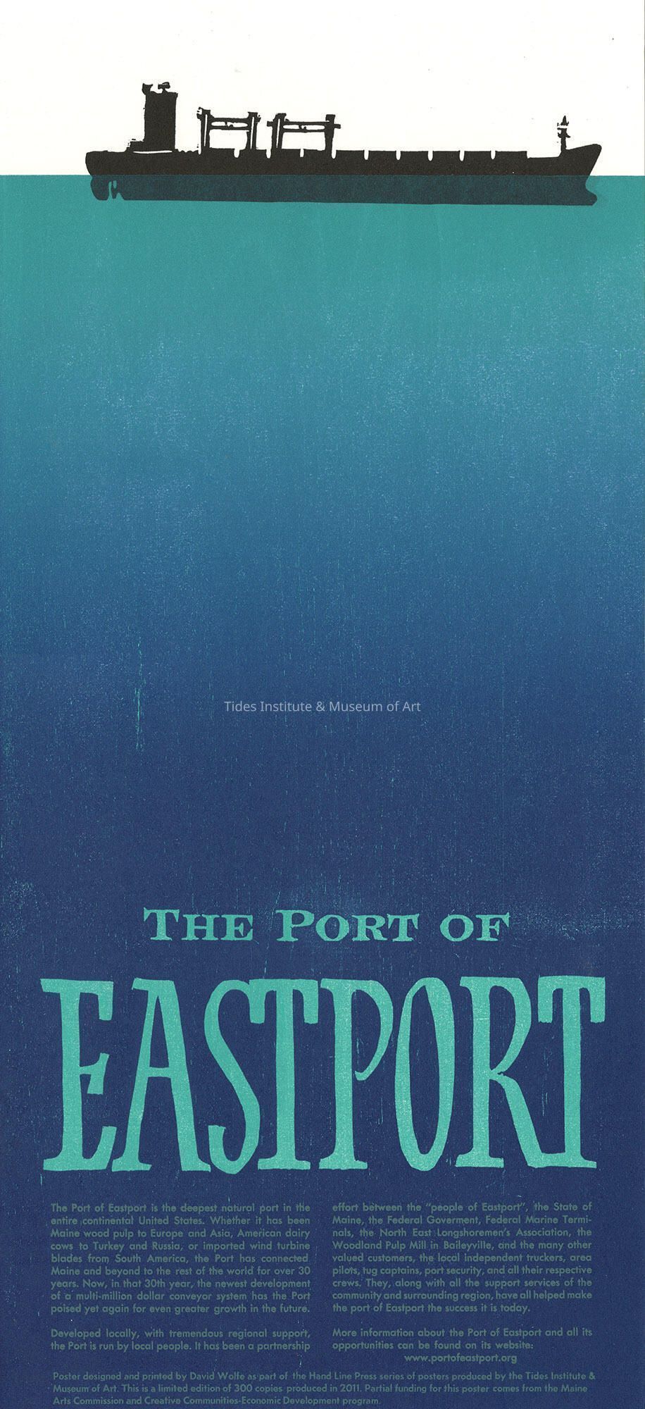 Poster designed and printed by David Wolfe as part of the Hand Line Press series of posters produced by the Tides Institute & Museum of Art. This is a limited edition of 300 copies produced in 2011. Partial funding for this poster comes from the Maine Arts Commission and Creative Communities = Economic Development program.
