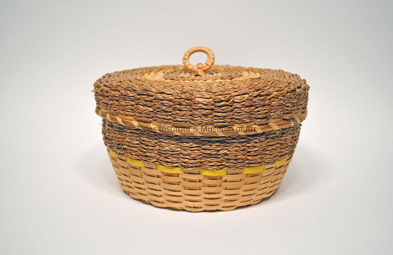 Artist: Irene Dana Classification: North American Basket Circa: 1995 Old Accession Number: 635 Description: Passamaquoddy. Medium size round basket. Second Shelf from Top.