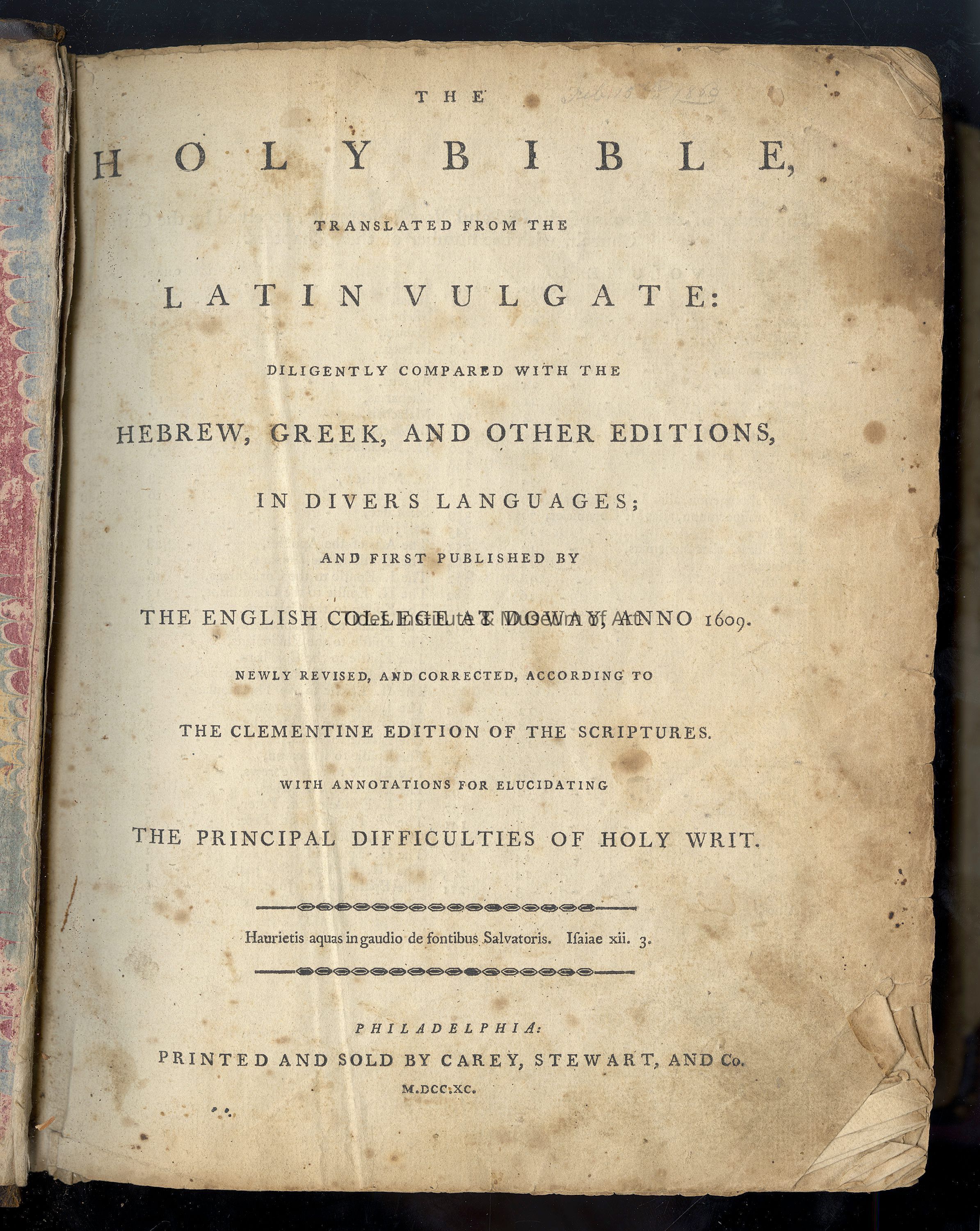 BIBLE, Douay Version. The Holy Bible, Translated from the Latin Vulgate: Diligently Compared with the Hebrew, Greek, and Other Editions, in Divers Languages; and First Published by The English College at Doway, Anno 1609. Newly Revised, and Corrected, According to the Clementine Edition of the Scriptures. With Annotations for Elucidating the Principal Difficulties of Holy Writ. Philadelphia: Carey, Stewart, and Co., 1790.