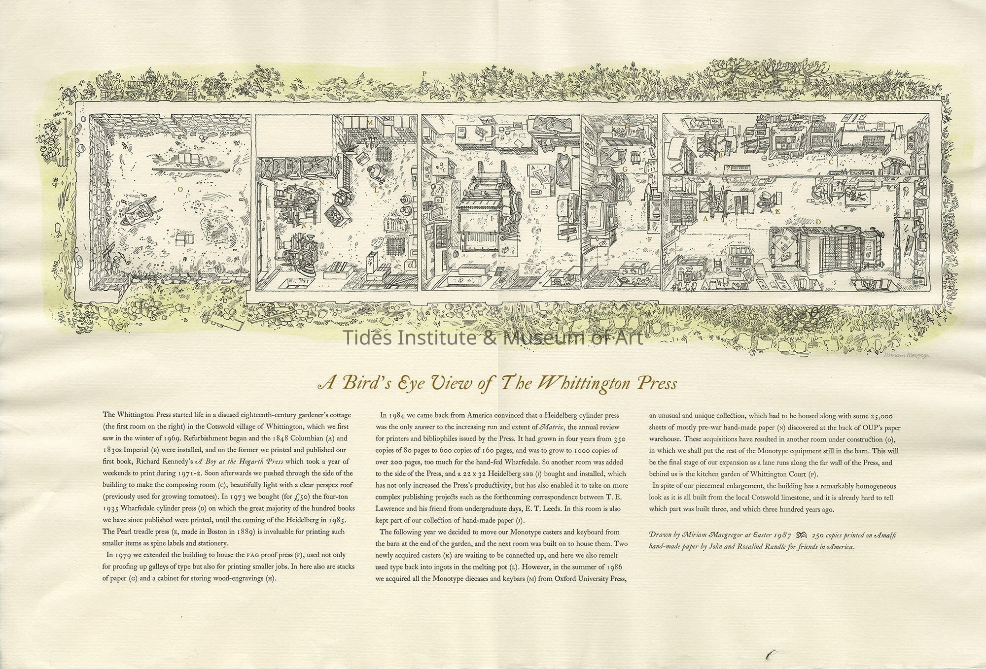 Miriam Macgregor | A Bird's Eye View of the Whittington Press | Engraving / Letterpress | 1987Description