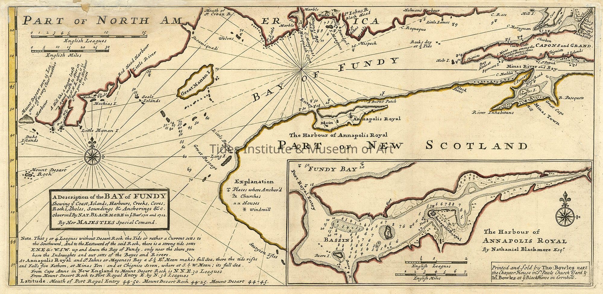 MOLL, Herman (1654-1732); & Nathaniel BLACKMORE A Description of the Bay of Fundy shewing ye coast, islands, harbours, creeks, coves, rocks & sholes, soundings & anchorings &c. Observed by Nat. Blackmore in ye year 1711 and 1712. by Her Majesties Special Command London: Printed and sold by Tho: Bowles next the Chapter House in St. Pauls Church Yard & Ino. Bowles at ye Black Horse in Cornhill, [circa 1745]. Copper-engraved map, period hand colouring in outline. Inset of "The Harbour of Annapolis Royal by Nathaniel Blackmore Esqr". Sheet size: 9 3/8 x 19 1/8 inches. An attractive map of the Bay of Fundy by one of the greatest cartographers of the eighteenth-century.