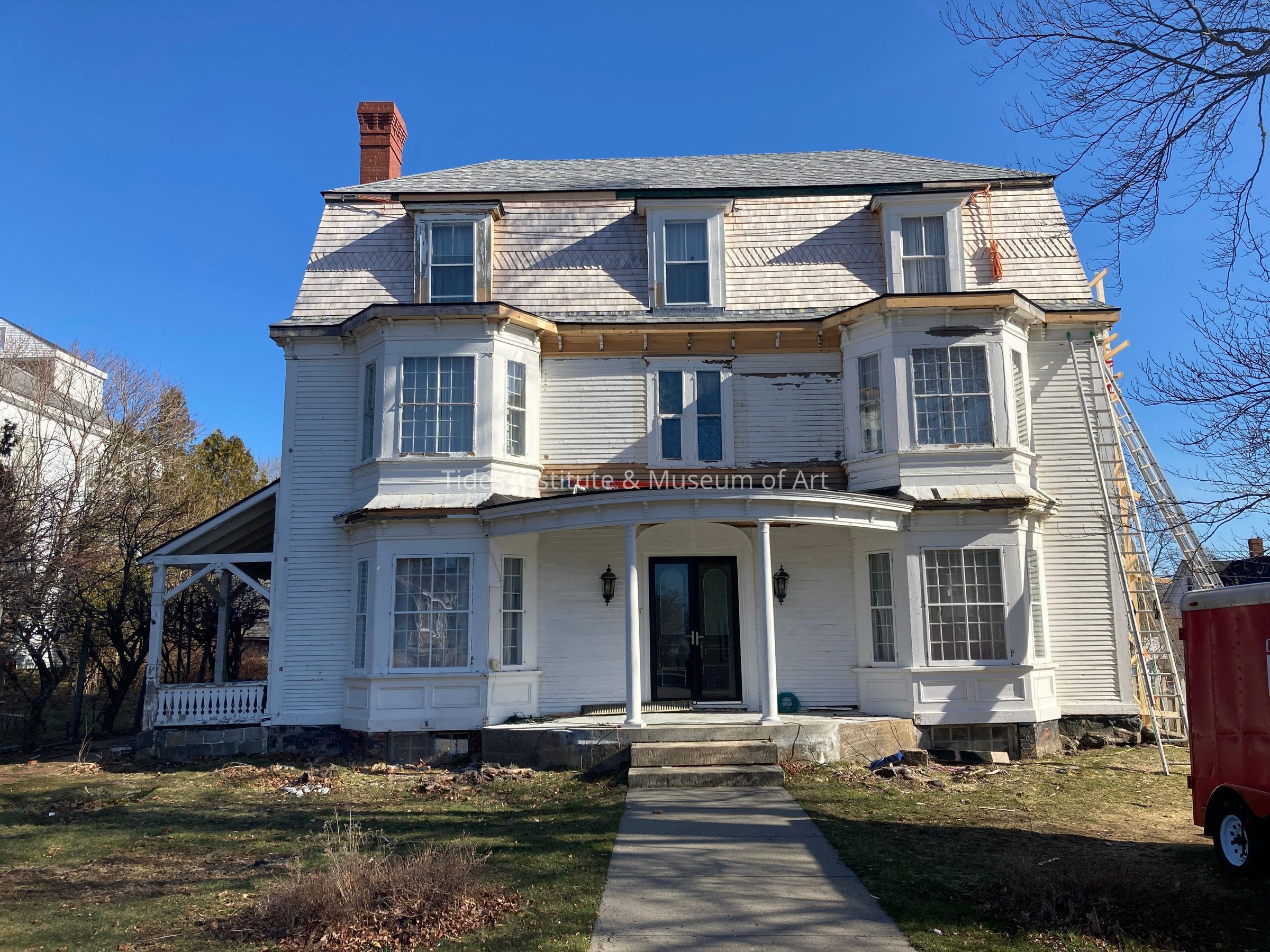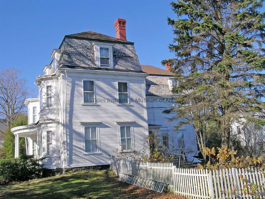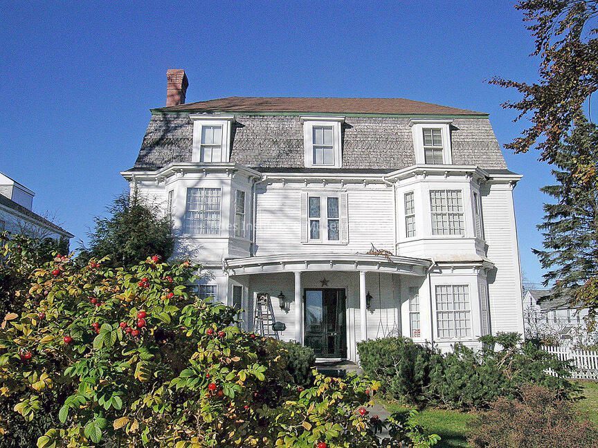 Aaron Hayden, deacon of the Calvinist Baptist Church of Eastport, had his home built on Boynton Street in 1807. The house was originally a two story hip roof federal style home, similar to the to several other federal period houses nearby. The building was later purchased by General S.D. Leavitt and extensively remodeled both inside and outside in 1882. A third story with mansard roof was added to the outside along with a side porch, bay windows. and bracketed cornice Inside the house saw the addition of new flooring, new ceilings and a new staircase. The fan over the door is one of the few remaining visible features of the original house. Aaron Hayden, Jr. (the nineteenth) and William Kilby (the twenty-ninth) representatives from Eastport to the Maine legislature, were born in this house. The house is now undergoing extensive restoration and is remarkably intact from its 1882 renovations.