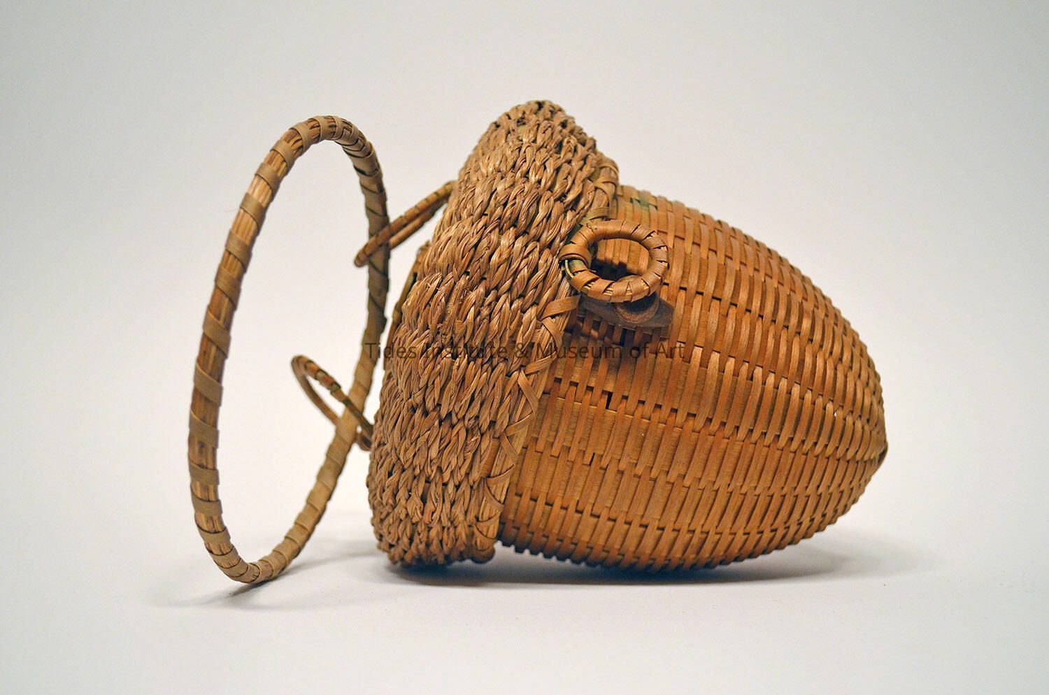 ?Passamaquoddy. Acorn shaped basket with attached lid and hoop handle. Top Shelf.