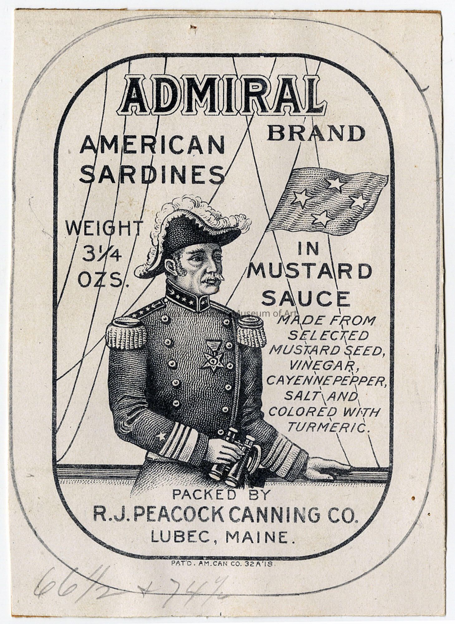 An original sardine label design for the Admiral Brand of American Sardines in mustard sauce packed by the R.J. Peacock Canning Company of Lubec, Maine. The design was produced by the American Can Company in the early 20th century. It is one of several hundred such original sardine label designs in the collections of the Tides Institute that the institute acquired from Barney Rier of Lubec, Maine in 2008. The label designs represent a wide range of sardine companies operating in the area (including in New Brunswick, Canada) and an equally wide range of imaginative high quality graphic designs. Barney Rier had amassed an extraordinary collection of original equipment, artifacts and historical documents relating to the sardine industry of this region. For many years, he displayed much of his collection in a sardine museum building next to his house along Route 189 in Lubec. The American Can Company, based in New Jersey, operated can manufacturing plants across the United States beginning in the late 19th century and in the early 20th century they established two such can manufacturing plants in this region, one in Eastport, Maine and one in Lubec. Barney Rier acquired his collection of original sardine labels from the American Can Company when their operations in Eastport and Lubec went out of business.