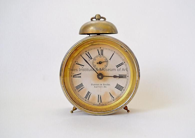 Alarm clock, c. 1880s. Clock has label for Forrest & Roche, jewelers, Water Street, Eastport, Maine. Made by Waterbury Clock Company of Waterbury, Connecticut.