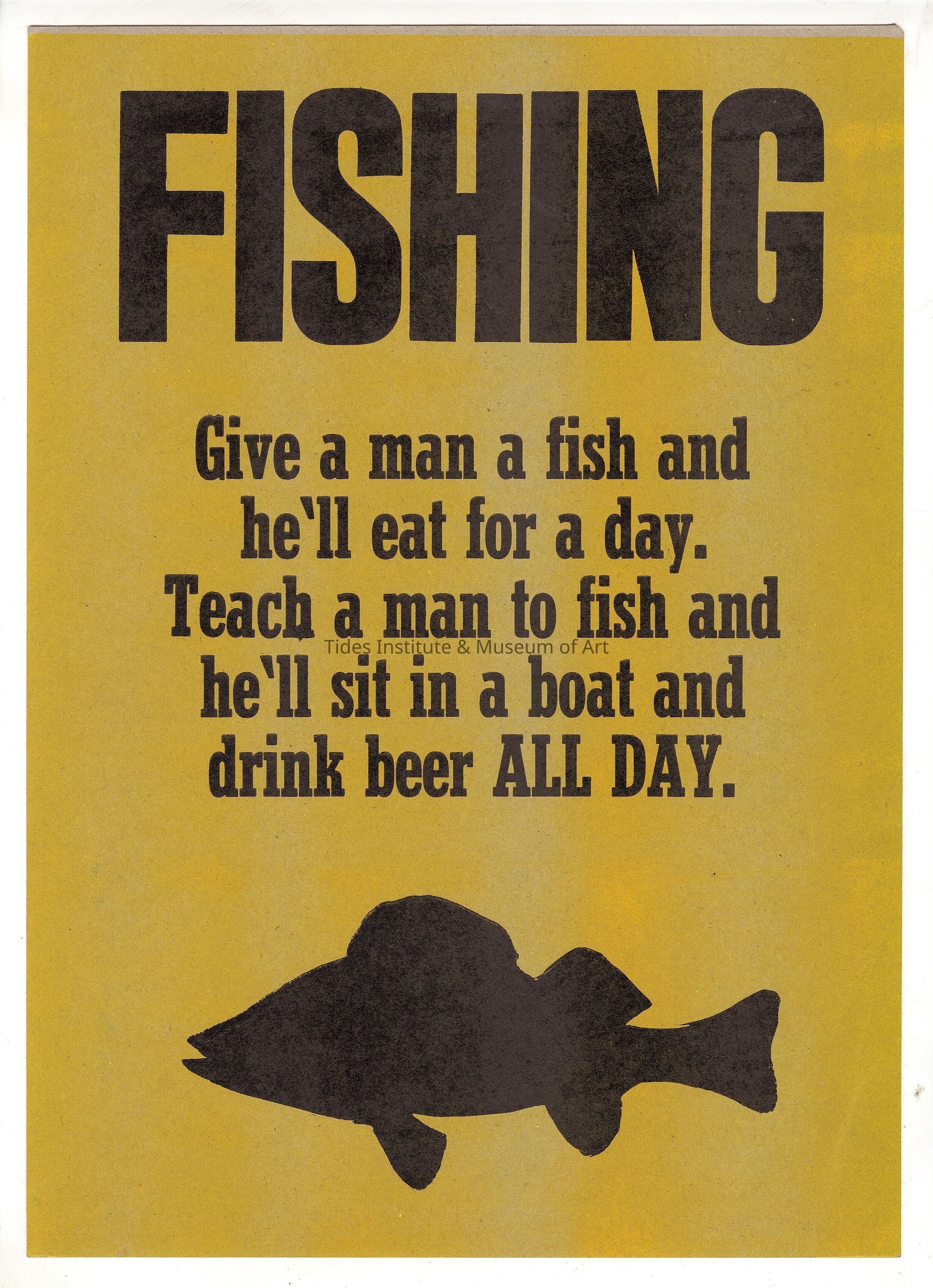 FISHING: Give a man a fish and he'll eat for a day. Teach a man to fish and he'll sit in a boat and drink beer ALL DAY. Gift of the artist, May, 2011. Amos Paul Kennedy spent almost a week in residence at the Tides Institute & Museum of Art (TIMA) in May 2025, giving a series of workshops at area schools and particpating in two printing sessions at TIMA with fellow printers, David Wolfe, Andrew Steeves, Siri Beckman and others.