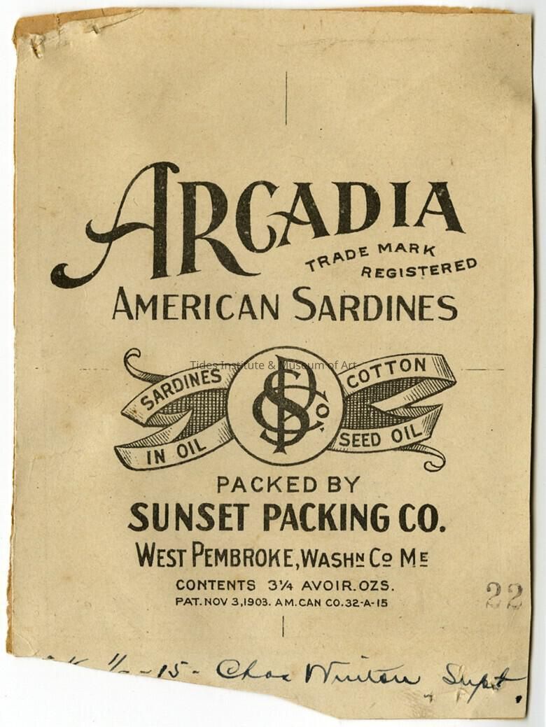Arcadia American Sardines. Trade Mark Registered. Sardines in Cottonseed Oil. Packed By Sunset Packing Co. West Pembroke, Washington County. Maine. Contents 3 1/4 Avoirdupois Ounces. Patent, November 3, 1903. American Can Company. 32-A-15. Original label purchased by the Tides Institute & Museum of Art from the collection of Julian "Barney" Rier of Lubec, Maine.