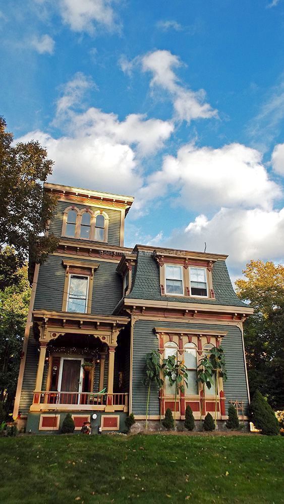 This Victorian home was built for Arthur R. Willey about 1876-1877. It is built in wood and has a distinctive three story tower with decorative wood ornamentation, and triple round headed windows in the third story. The main part of the house has a mansard roof, heavy ornamental lintels, bracketed cornice and bay windows. A carriage house once stood behind the bam. AFN