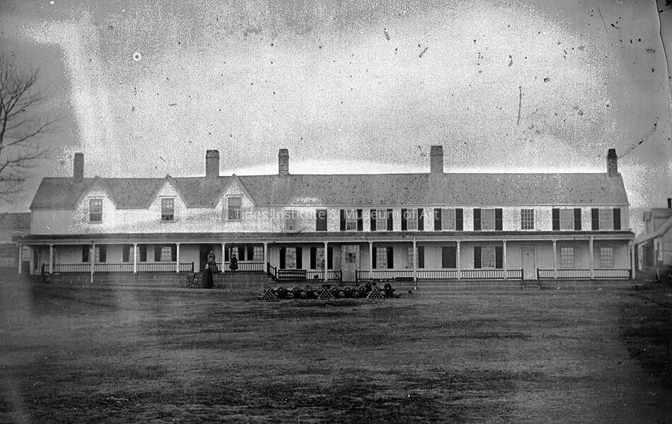 The Barracks building was once part of the Officers Quarters at Fort Sullivan and stood on Fort Hill overlooking Eastport. The building was originally constructed In 1822 as a house for the fort’s sutler and stood next to the fort's hospital. In 1827 the Army purchased the house for an addition to the northern end of the Officers' Quarters This northern section became part of the long Officers’ Quarters’ building. In 1877, soon after the fort was decommissioned in 1873, the Officers’ Quarters was cut into three pieces and sold. The northern section was moved to its present location on Washington Street..This two and one-half story wooden clapboarded structure has a five bayed front with twelve over eight light windows, and a transom light over the door. The building is owned by the Border Historical Society. It has been listed on the National Register of Historic Places since 1969.