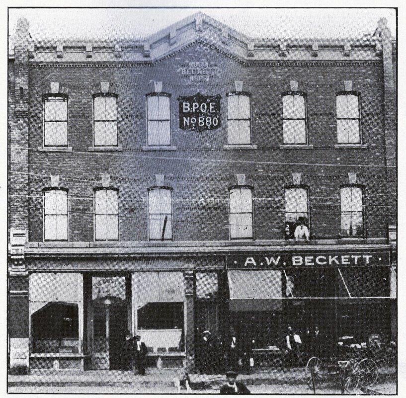 26) Beckett Block (NR) 34, 40 Water St., 1887, Italianate. This was AW. Beckett's confectionery store, with its ovens in a separate building in back. He was noted for making his own candy. The I.O.O.F. had their lodge on the second floor.