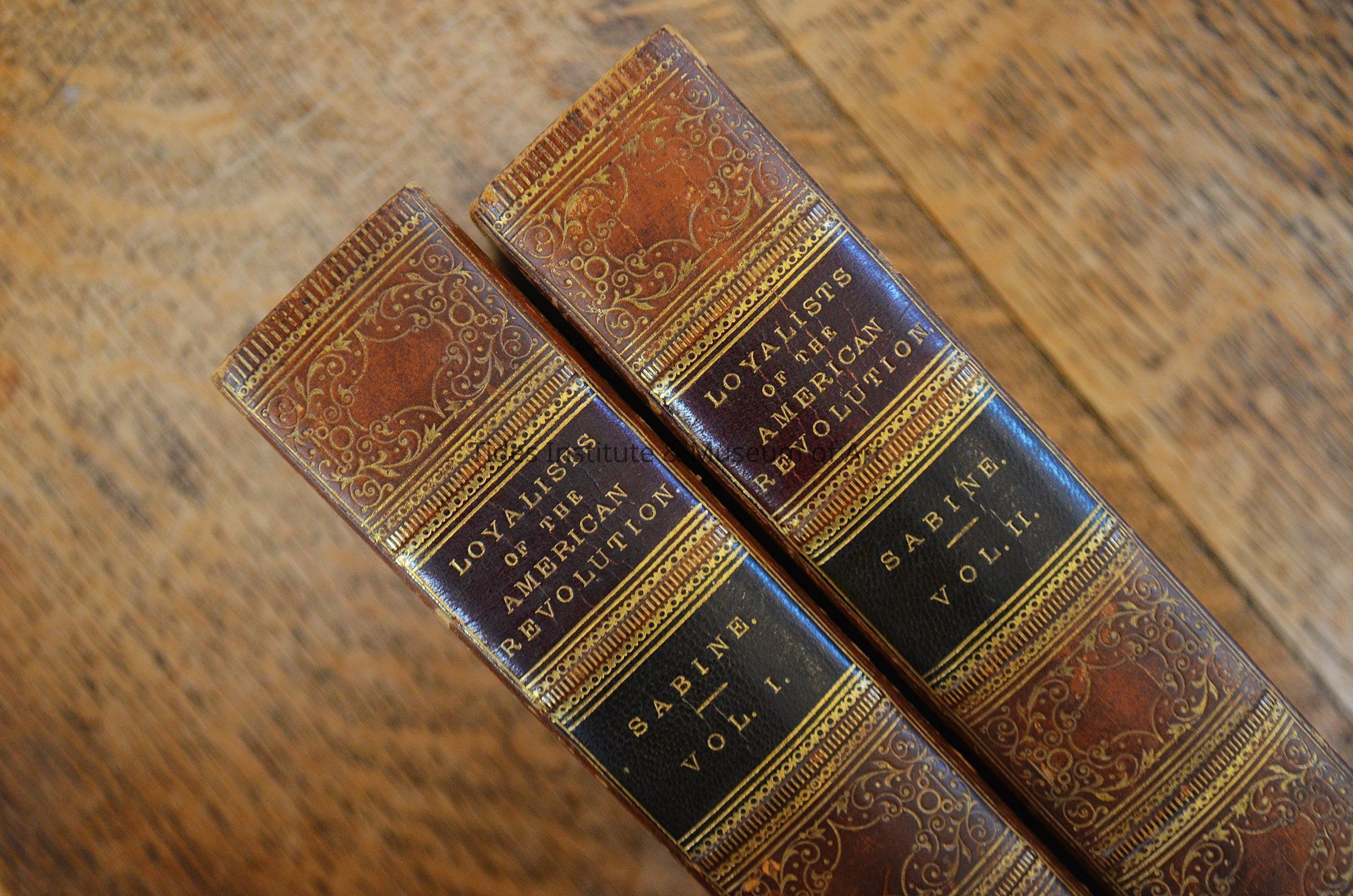 A two volume one of a kind special leather bound second edition of Biographical Sketches of Loyalists of the American Revolution with An Historical Essay by American historian Lorenzo Sabine and published by Little, Brown and Company of Boston in 1864. The volumes are inscribed by Sabine to his daughters. The two volumes represent a significant expansion on Sabine’s earlier single volume first edition on the same subject published by Charles C. Little and James Brown of Boston in 1847. The first edition ran 733 pages, the second edition over 1,200 pages. Born in New Hampshire, Sabine moved to Boston, Massachusetts, with his parents in 1811 and to Hampden, Maine, in 1814. At the age of eighteen, he moved to Eastport, Maine. From early on, Sabine, was, in his words, "revolution-mad." But it wasn’t until he moved to the eastern coast of Maine with its border with the American Loyalist founded province of New Brunswick that he was able to pursue his research interests and have the necessary research resources readily available. Here he could engage in his belief that "there was more than one side to the Revolution." The attitude in the United States up to this was that every Loyalist must be bad and every Patriot must be good. When the first edition of his work on the Loyalists appeared in 1847, it created great controversy. Jared Sparks, the Harvard College historian, was one of the few people and scholars to commend the book. Sabine died in Roxbury, Massachusetts in 1877 and he is buried in Hillside Cemetery in Eastport.