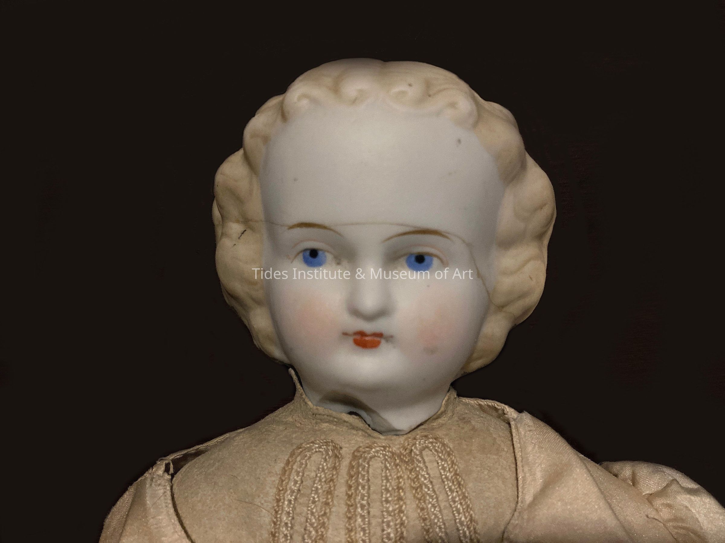 THREE GENERATIONS PORCELAIN DOLL, 1880s! A family handed down bisque porcelain doll, likely made in Germany or France, that recently came into our collections. It was a childhood doll that belonged to the donor's grandmother, Helen Prince Wadsworth Raye (1880-1968), of Eastport, Maine and dates to the early 1880s. The doll's current dress was made from the grandmother's wedding dress and was likely made by the grandmother later in her life. When her grand-daughter, the donor, was a young child, the grandmother gave her the doll. The donor's first name is the same as her grandmother's and she was likely named for her.