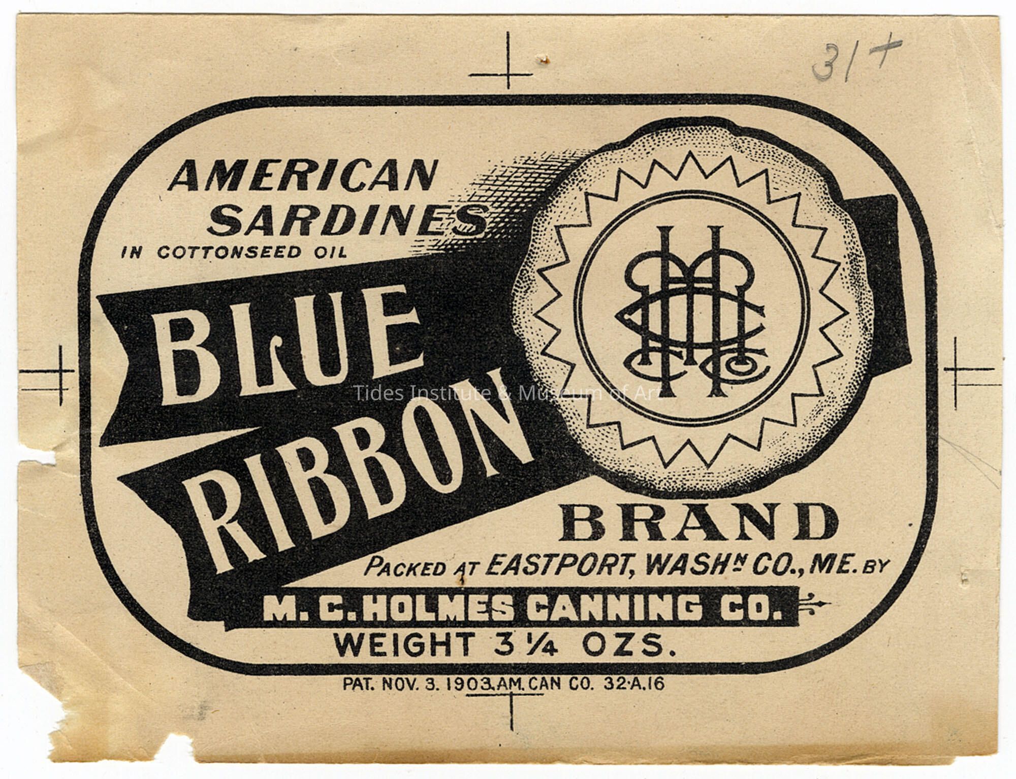 Old Accession Number: 743 Circa: 1903 Description: Packed at Eastport, Washinton County. ME. M.C. Holmes Canning CO.