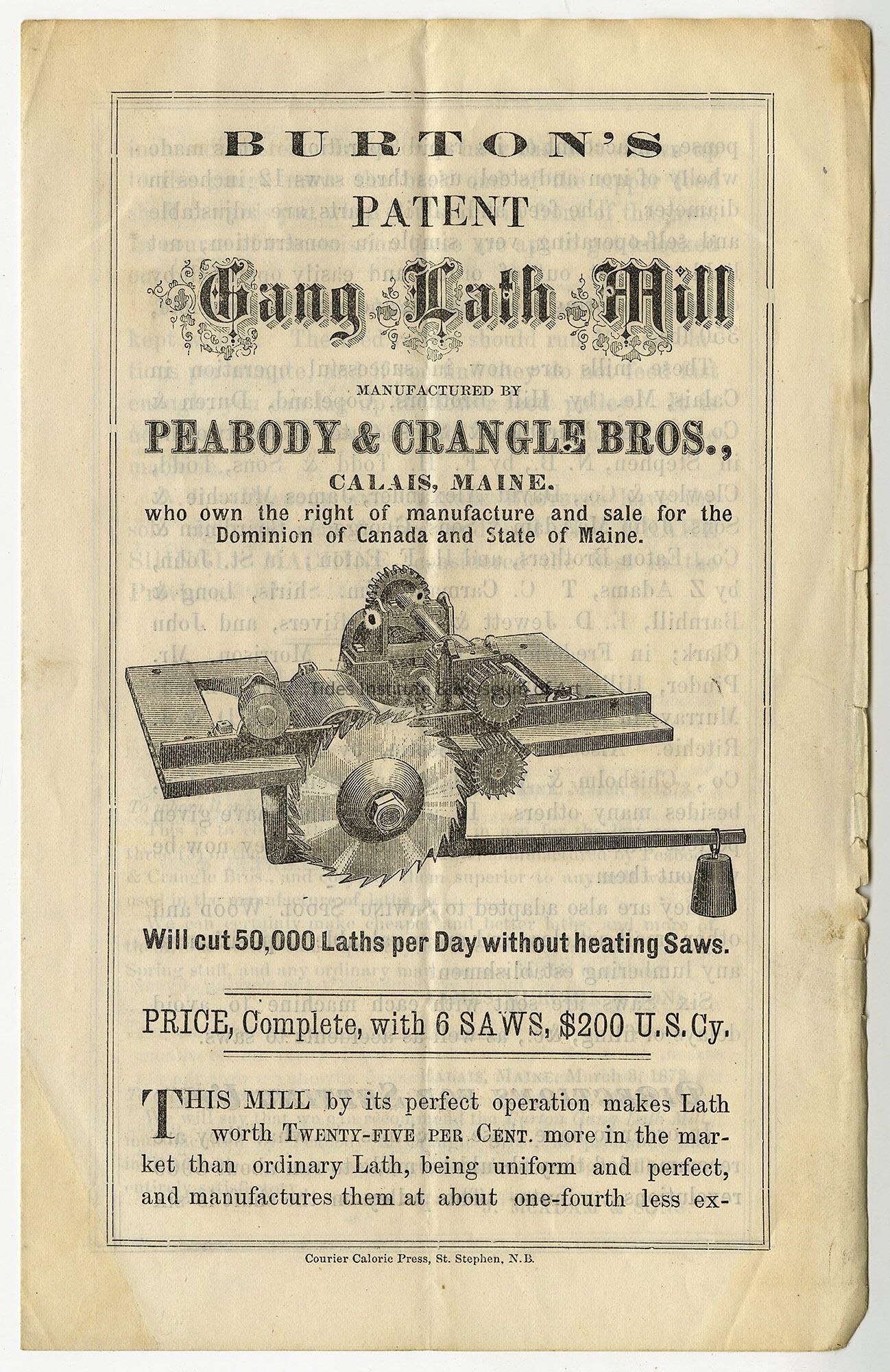 Burton's Patent Gang Lath Mill - Peabody & Crangle Brothers, Calais, Maine | [No Artist Defined]