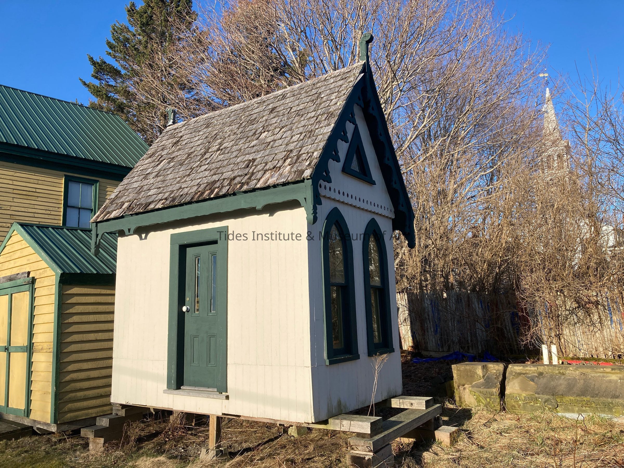 This full size Gothic style children’s playhouse dates to about 1900. A then mayor of Eastport, Maine, Edward S. Waide (1867-1944), and his wife and artist, Martha “Mattie” Waide (1857-1929), had the playhouse originally built for their daughter, Dorothy Waide (1894-1974). The playhouse is appoximately 12 feet high, nine feet long and six feet wide. It has a door on each of the long sides and two Gothic arched windows at each end with a triagle shaped window above. For many years the playhouse stood on the lawn surrounding the Waide’s large historic Hayden house home in the center of Eastport at 17 Boynton Street. It stood in front of part of an attached barn to the house. In the early 1940s, the playhouse was removed to be next to a house at the outskirts of Eastport. The playhouse was gifted to TIMA in 2017 by Sheila and Ronald Sullivan (1935-2016) and family and moved to a temporary location next to TIMA’s GAR Civil War Veteran’s Hall building. Sheila grew up and lived at the house on the grounds where the playhouse had been moved to in early 1940s by her father, Leslie Grant (1907-1971). Ronald Sullivan’s grandfather, Guy Sullivan (unknown-1944), built the playhouse in the late nineteenth century for the the Waide family with help from his son, James Sullivan (1895-1965), Ronald’s father. In the summer of 2025, the restored playhouse will be moved to the rear of TIMA’s Central Meeting House where TIMA is developing a small contemplative park. The playhouse will then be a half block away from where it originally stood.