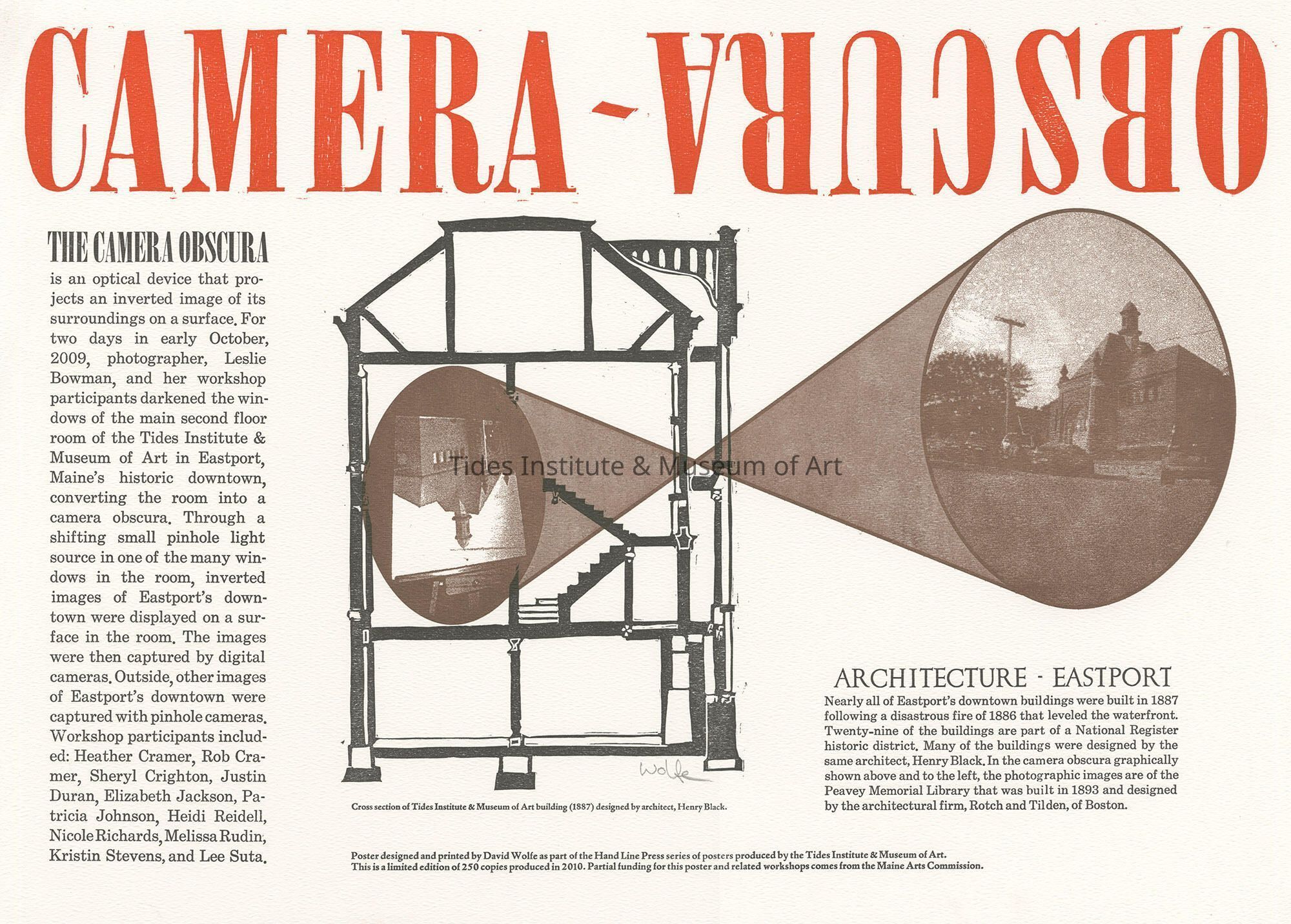 Poster designed and printed by David Wolfe as part of the Hand Line Press series of posters produced by the Tides Institute & Museum of art. This is a limited edition of 250 copies produced in 2010. Partial funding for this poster and related workshops comes from the Maine Arts Commission.