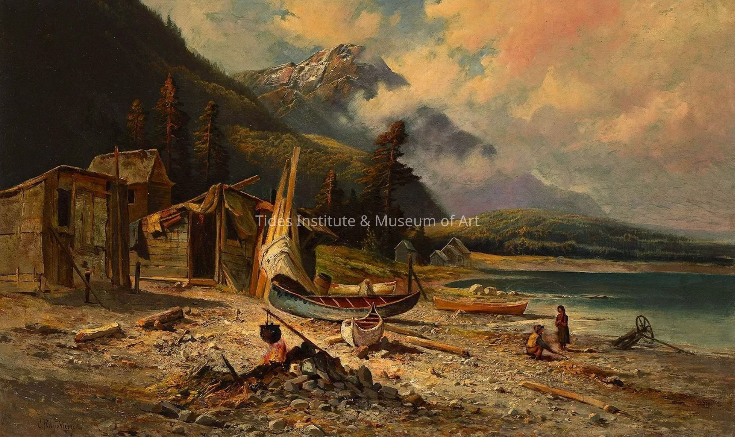 Born in Germany, C. Philipp Weber, and his cousin the artist Carl Weber, lived and worked in Philadelphia and were active in several artists groups there. Both artists focused on painting vigorous, untamed nature in the Barbizon tradition. Like Alfred Thompson Bricher, C. Philipp Weber traveled to Grand Manan Island, New Brunswick during the 1870s. Aside from the fishing camp depicted in the present painting, Weber also painted from Fish Head at the tip of the island. Based primarily in the state of Maine, the Passamaquoddy tribe used Grand Manan and its surrounding islands as summertime hunting grounds.