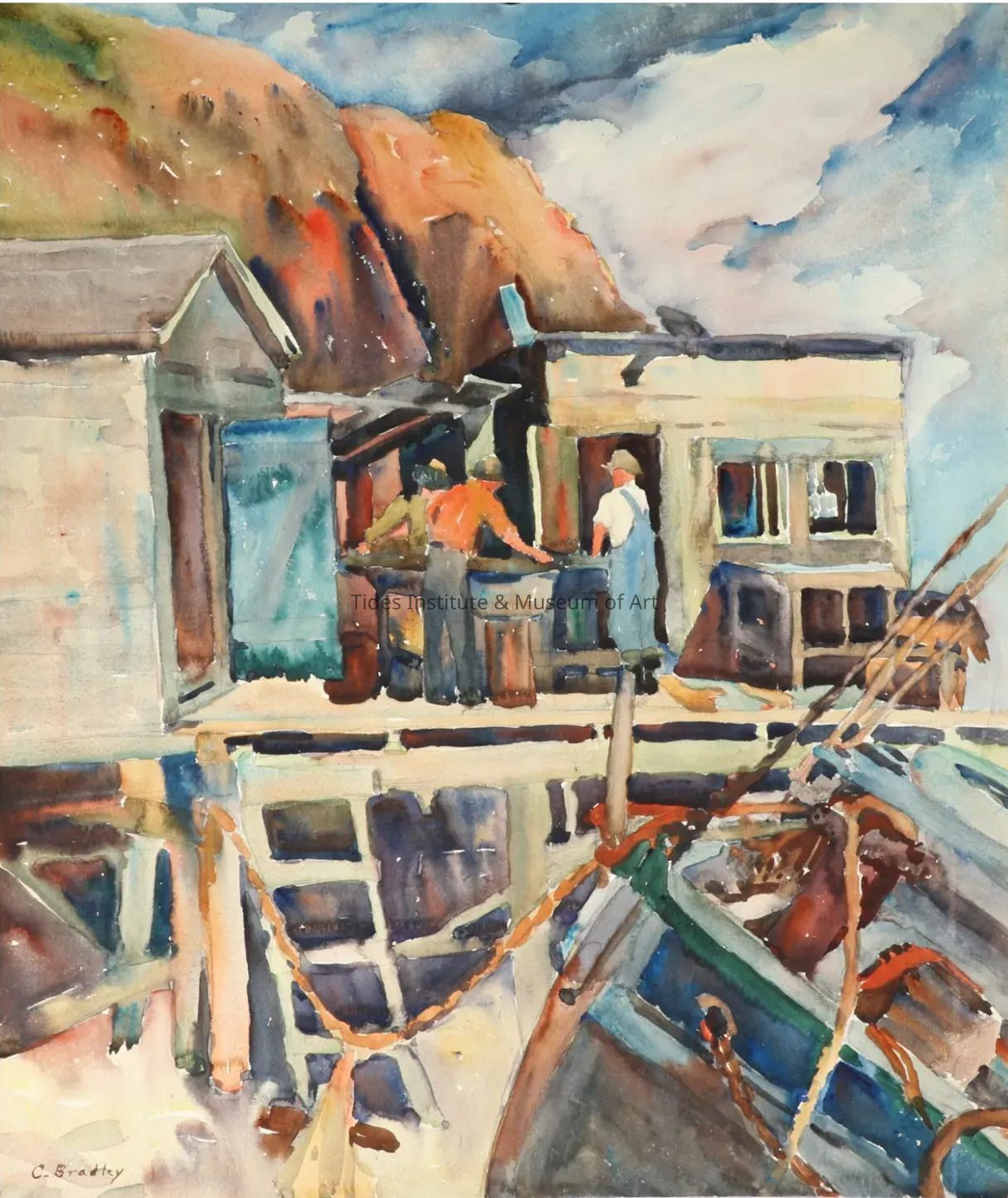 Carolyn Gertrude Bradley Ohio, Indiana (1898 - 1954) Eastport, Maine, 1932, boat dock watercolor on paper Signed lower right, titled and dated verso. From AskArt: Carolyn Bradley was a well-known Indiana and Ohio artist, whose specialty was watercolor although she also painted with oil, and subjects included landscapes, seascapes, industrial scenes, coastal views, and other marine subjects. Bradley was educated in the Richmond, Indiana public schools and graduated from Earlham College with a B.A. Degree. She earned advance degrees in art from the University of San Miguel Allende in Mexico. She was a professor of fine and applied arts at Ohio State University in Columbus from 1934 to 1954, and before that, taught for many years at Emmerich Manual Training High School in Indianapolis and before that at Richmond High School in Richmond. In 1946, she was given a leave of absence from her University position to serve as an Ambassador of Good Will as a United States government consultant and teacher in arts and crafts in Santiago, Chile. She visited many art schools and consulted with teachers. Immediately preceding this appointment, she taught in the summer school of the University of Chile, also at Santiago. Other travels included painting trips in Portugal, Italy, Bavaria and the East Coast of the United States including Gloucester and Rockport, Massachusetts.