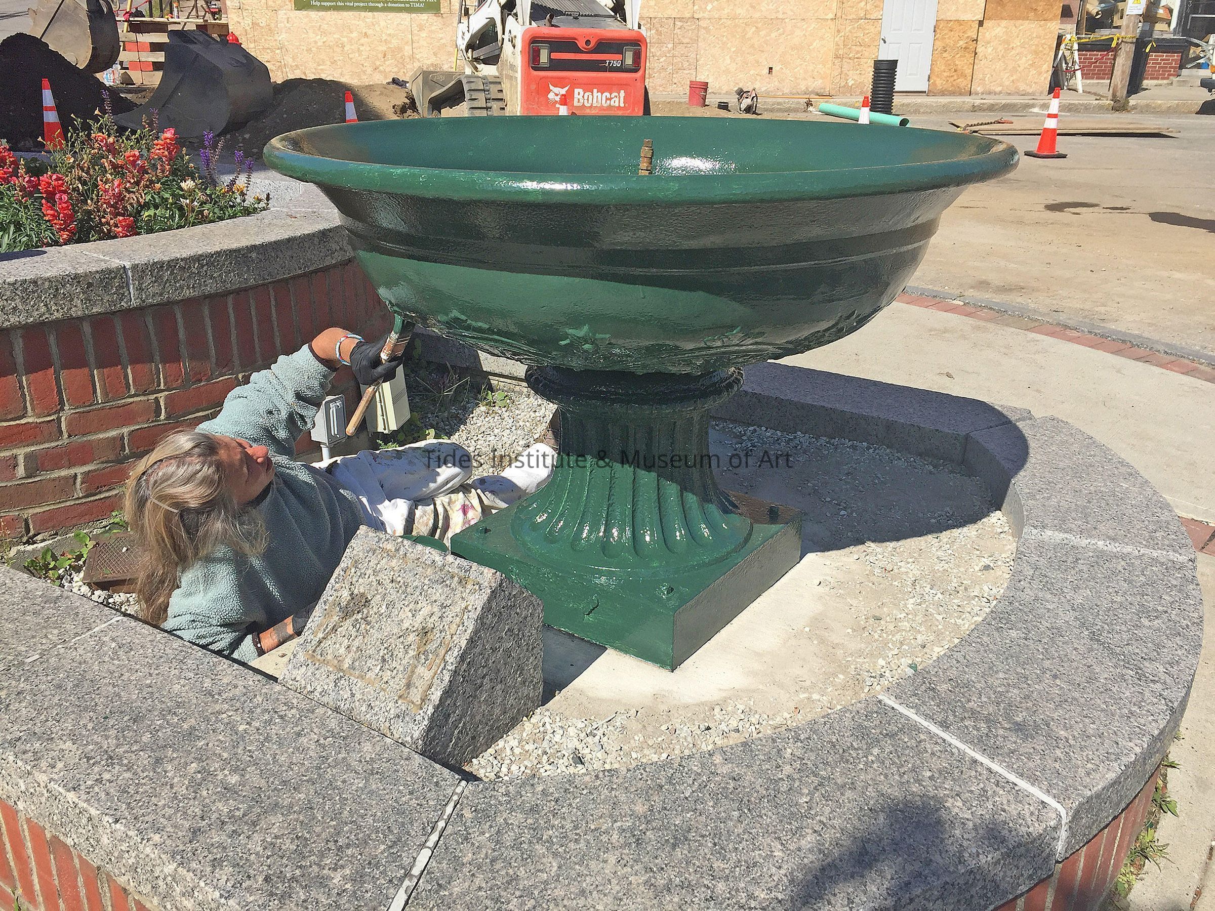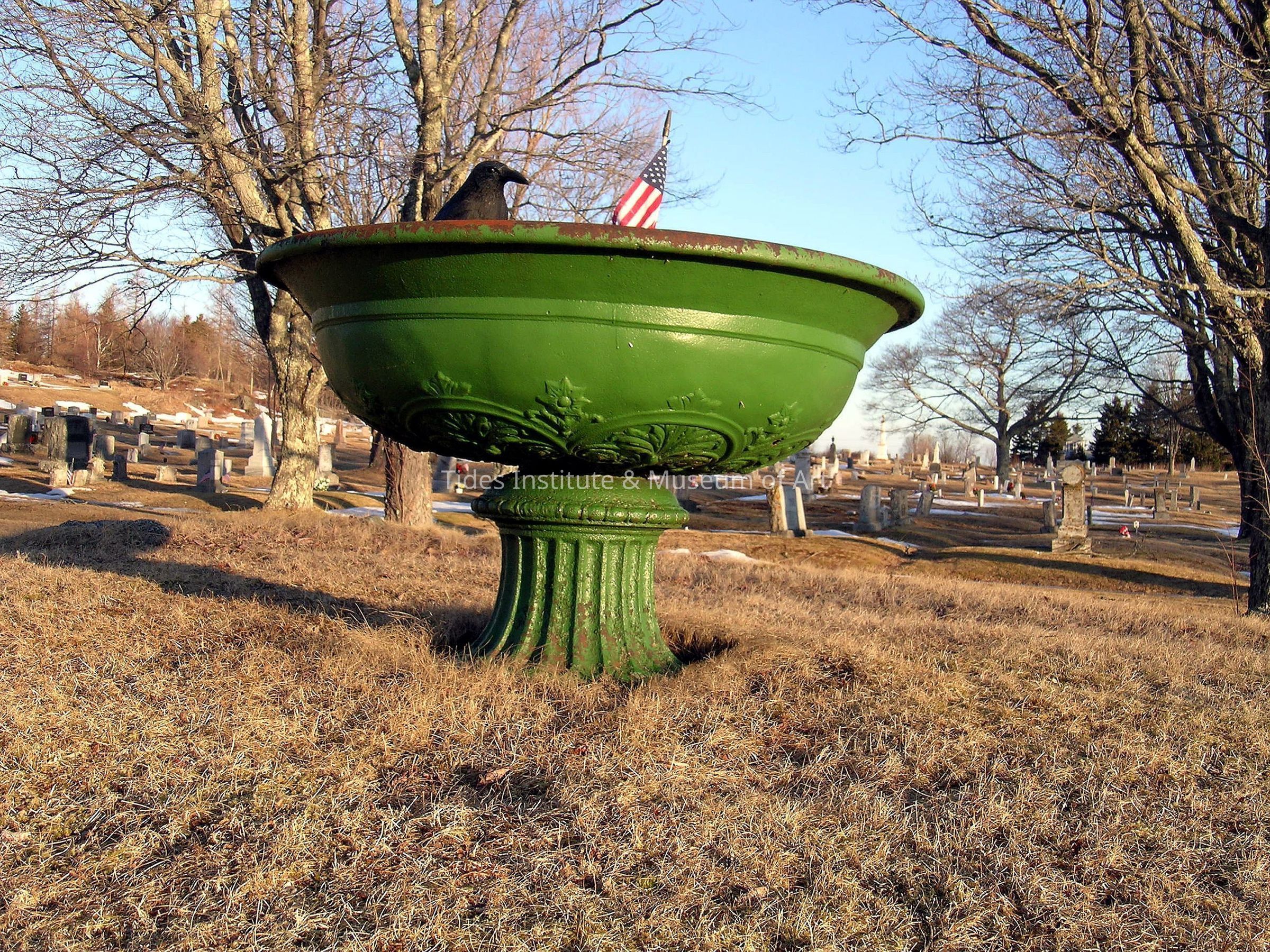 A late 19th century cast iron water fountain that stands in front of the Tides Institute’s main building at Bank Square in downtown Eastport, Maine. In 1889, three years after a devastating fire leveled Bank Square and Eastport’s downtown and waterfront, the fountain was installed at virtually the identical spot where it now stands. A group of civic minded citizens raised the necessary $125 in funds to purchase the fountain from the J.L Mott Ironworks Company of New York City and bring it to Eastport. The fountain’s water basin is four feet four inches in diameter with a depth of 14 inches. Originally, the fountain had a tall center standard water spout (that has since been lost) and stood five feet eight inches in height. The water fountain remained at Bank Square until the early 20th century when, with the advent of the automobile, the fountain was relocated to Eastport’s Hillside Cemetery as a decorative, non-functioning fountain. In 2006, the fountain was returned to Bank Square as part of the development of a new civic space in front of the Tides Institute’s main building. A small, adaptive center water spout was installed on the fountain to make it fully functional again. Nine years later, in 2015, the fountain was donated to the Tides Institute by the then owners of the fountain, the local branch #558 of the Veterans of Foreign Wars (VFW). The local branch was disbanding and the branch felt that the Tides Institute was the best hope to preserve the fountain in the future. The Tides Instittute maintains the fountain. In 2012, the Tides Institute acquired from a Chicago antiques dealer an original copy of the J.M. Mott 1883 advertising catalogue for statuary, fountains, and more that includes the Bank Square water fountain model.