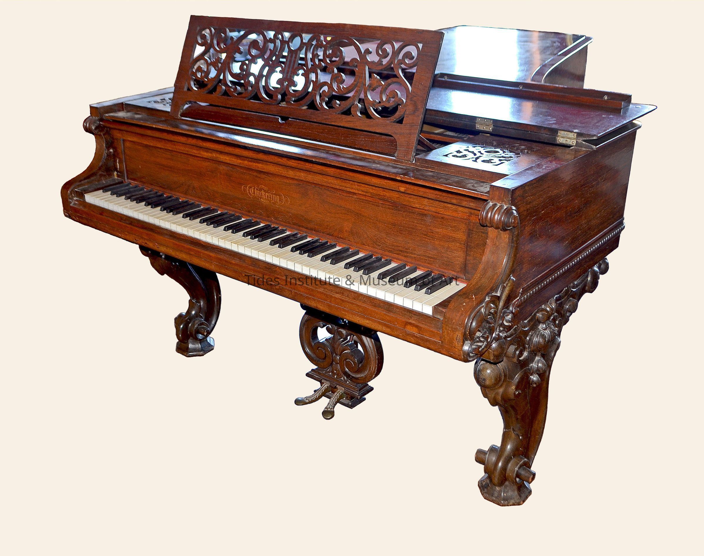 A grand piano made by the Chickering and Sons piano company of Boston, Massachusetts in 1868. The piano serial number is: 32980. For many years, the piano was owned by Benjamin Whelpley, a pianist and composer of piano music, who was born in Eastport, Maine in 1864 and who had a long career in Boston. Whelpley maintained the family home, an impressive historic greek revival house, in Eastport where the piano long resided. Dennis Hooper, of Saint John, New Brunswick, recently related some of the story of Whelpley and the Chickering piano as Hooper used to spend weekends during the summer months in the Whelpley house in Eastport while Whelpley was still alive. According the Hooper, Benjamin Whelpley lived at the house when he was not performing elsewhere. The Chickering grand piano was given to Whelpley by the Chickering Piano company. The piano is hand carved and made of rosewood and copper strung. Benjamin Whelpley took the piano everywhere where he was performing. When he was at Eastport, Whelpley would give concerts at the house on Sundays and many people, including President Franklin Roosevelt and Eleanor Roosevelt when they were at their summer cottage on nearby Campobello Island, New Brunswick, would come to hear the concerts. Whelpley died in 1946 and the piano remained in the house until 2007 when new owners of the house donated it to the Tides Institute. The piano remains in relative good shape and the Tides Institute hopes to have it restored and played again.