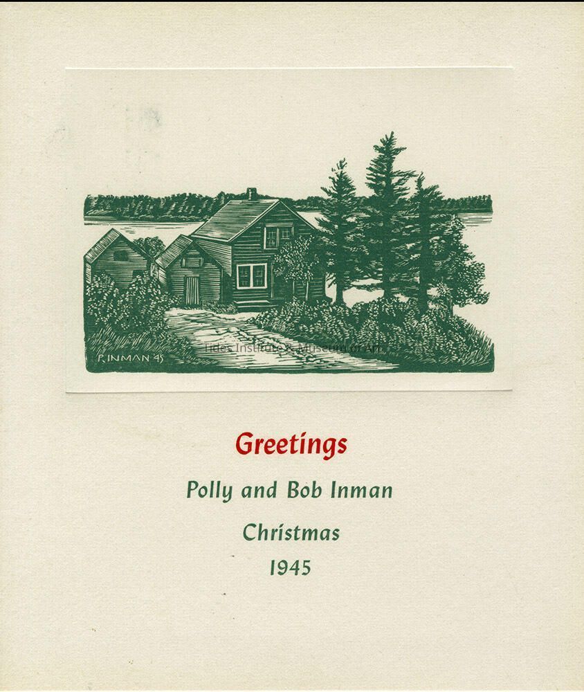 House by a lake printed in green ink. Holiday greeting card from Polly and Bob Inman (text in green and red). 1 of 2 copies.