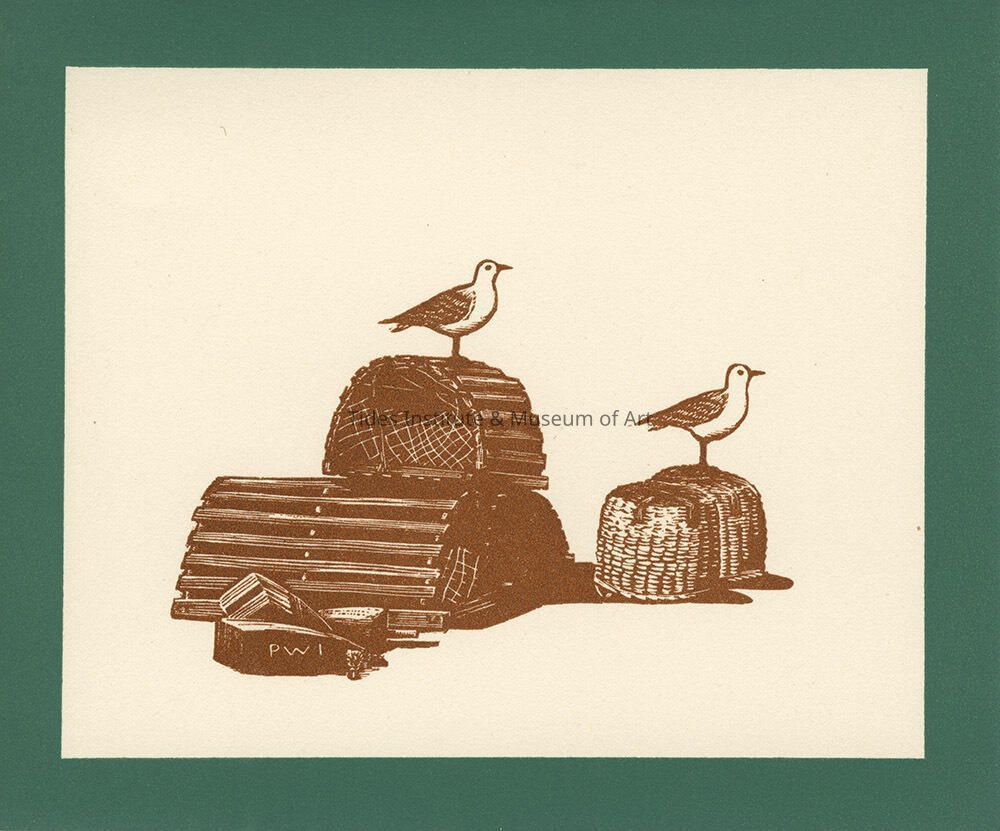 Seagulls and lobster traps printed in brown ink on card with dark green border. Holiday greeting card from Polly and Bob Inman. 1 of 2 copies.