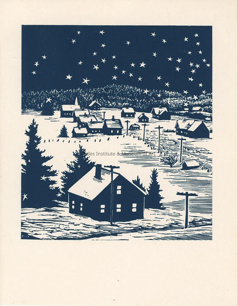 Snowy scene printed in blue ink. Holiday greeting card from Pearl Adair Winchester. 1 of 2 copies.