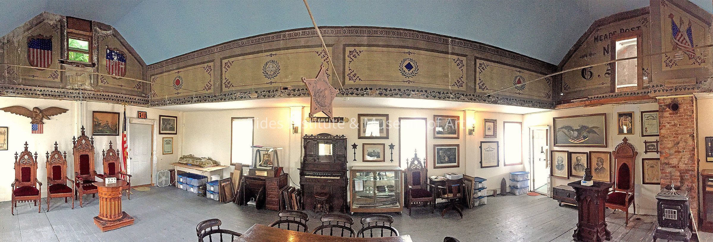 A Civil War mural running the length of the upper walls of the second floor of a former Civil War GAR (Grand Army of the Republic) Veterans Hall building in Eastport, Maine that is owned by the Tides Institute. It is the only such Civil War mural in Maine. The original two and a half story GAR Hall building dates to the 1820s and was first used as a Baptist vestry. When the Baptist Church established a new vestry space within its own separate church building in 1881, their vestry building became available to the local GAR veterans group that was organized after the American Civil War. The second floor of the building became the meeting room for the veterans group and they had the longer north and south walls decorated with a series of four panels, making a total of eight, each with a distinctive Union Army Corp badge numbering from one to eight. The shorter end east and west walls of the room were decorated with the name of the local GAR post (Meade Post No. 40) and with American flag shields and draped flag designs. The mural was very likely painted by local decorative painter, Harry Harrington, as he painted a similar mural in an adjacent Armory building at about the same time. This building and mural did not survive. A dropped ceiling, installed in the middle of the room in the early 20th century long hid the mural from view, but in 2010, after the hall building was sold to new owners, the mural was rediscovered and the dropped ceiling removed. The mural suffered considerable water damage over the years as it was painted with a distemper water soluble paint. The Tides Institute has had the mural restored by Tony Castro, an experienced restorer, of New Gloucester, Maine.