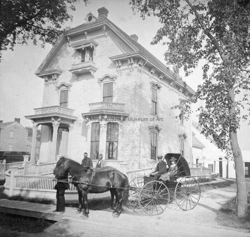 Standing on Court Street is this Italianate residence built for Clark D. Perry in 1868. Clark Perry was born in Machias, and was a very successful businessman in the lumber and shipping industries. Much of the lumber for the house came from Perrys own business, and Haskell Preble of Machias was the master builder. The house has a gable roof with a jerkin head on the front of the house, the cross-gable wing, and the dormers. The front portico has elaborate wood detail which is repeated in the bay window. The windows have peaked lintels, and the cornice is supported by paired brackets. The house has a one and one-half story wing in back and a gabled roof bam. FAB, AFN, JCB