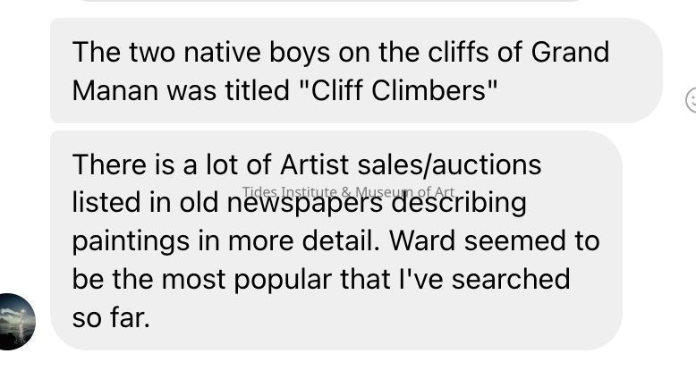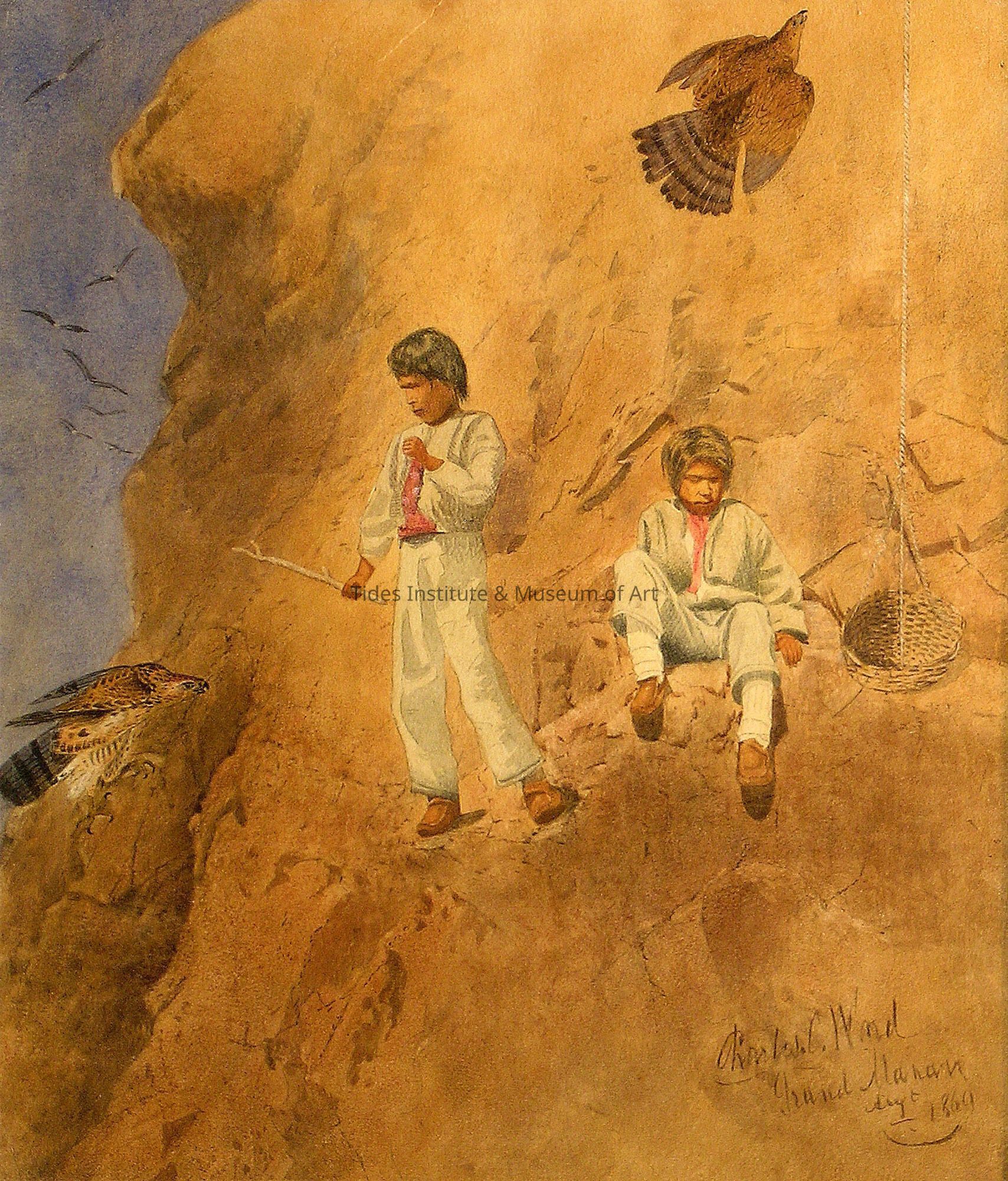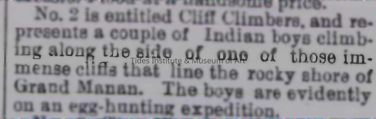 An 1869 watercolor (9.5 inches by 11.5 inches) by New Brunswick artist, Charles Caleb Ward of Peskotomuhkati/Passamaquoddy youths gathering gull eggs on the cliffs of nearby Grand Manan island in New Brunswick. Historically, for the Passamaquoddies, Maine’s current political boundary line was non-existent and Passamaquoddies homeland and territory extended to both sides of the border. In the nineteenth century and long before, they were frequently on Grand Manan for fishing and sealing, to collect gull eggs found on the steep island cliffs and for other activities. In 2004, the Tides Institute learned of the existence of this painting from a tip from Donald Soctomah, long time Passamaquoddy tribal historic preservation officer. The watercolor was coming up for auction at Heritage Auction in Dallas, Texas and the Tides Institute was able to mount the successful bid after raising the necessary funds to cover the bid. It is one of two paintings by Ward in the Institute’s collections. The other is an oil painting portraying a Passamaquoddy hunter in the woods of Charlotte County, New Brunswick. Charles Caleb Ward did many paintings of the Passamaquoddies during this time while living and working in St. George, New Brunswick. He was born in Saint John, New Brunswick in 1831. Later he spent time in Liverpool, England to learn about the shipping business, but also learned figure painting with the English artist, William Henry Hunt. Ward also lived in New York City for awhile where he studied landscape painting with artist, Asher B. Durand, and maintained a studio in the city. He died in 1896.