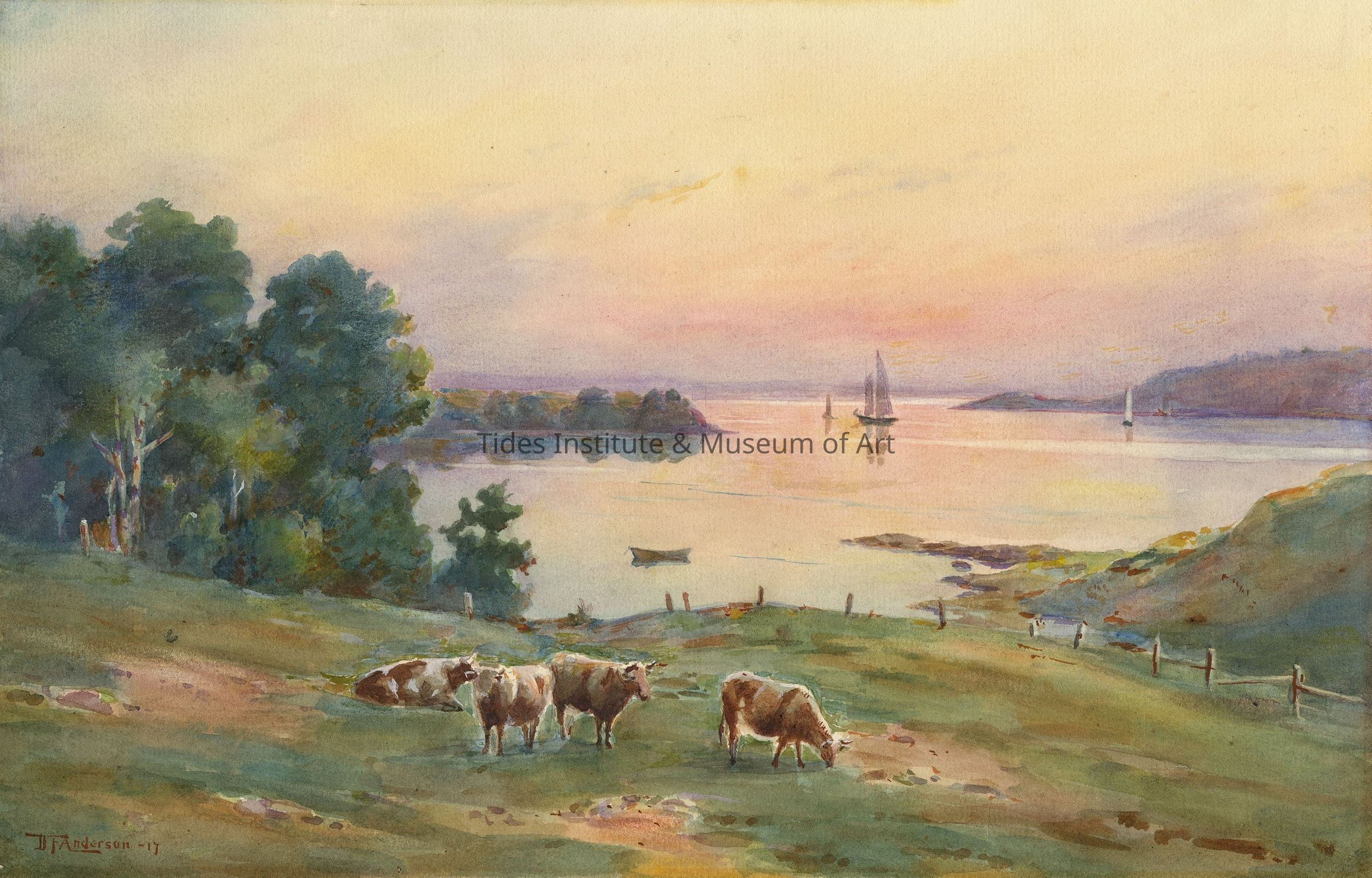 Watercolor painting by Dougal Anderson of Eastport, Maine. Painting dates to about 1890. Scene could be a view of Broad Cove in Eastport with Shackford Head in the let background.