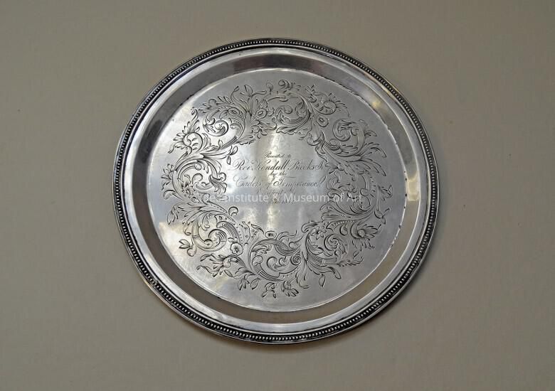 Coin Silver Presentation Dish. Made by Jones, Ball & Company of Boston. 1852. Inscribed: "Presented to, Rev. Kendall Brooks Jr., by the Cadets of Temperance, Eastport, Me. Sep. 3d, 1852." Pure silver coin.