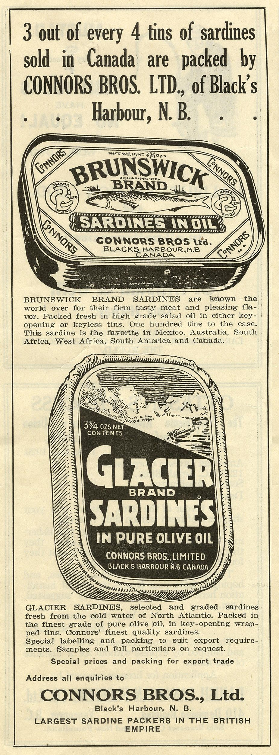 CONNORS BROTHERS SARDINES | Advertisement from Canadian Fisherman, July, 1926