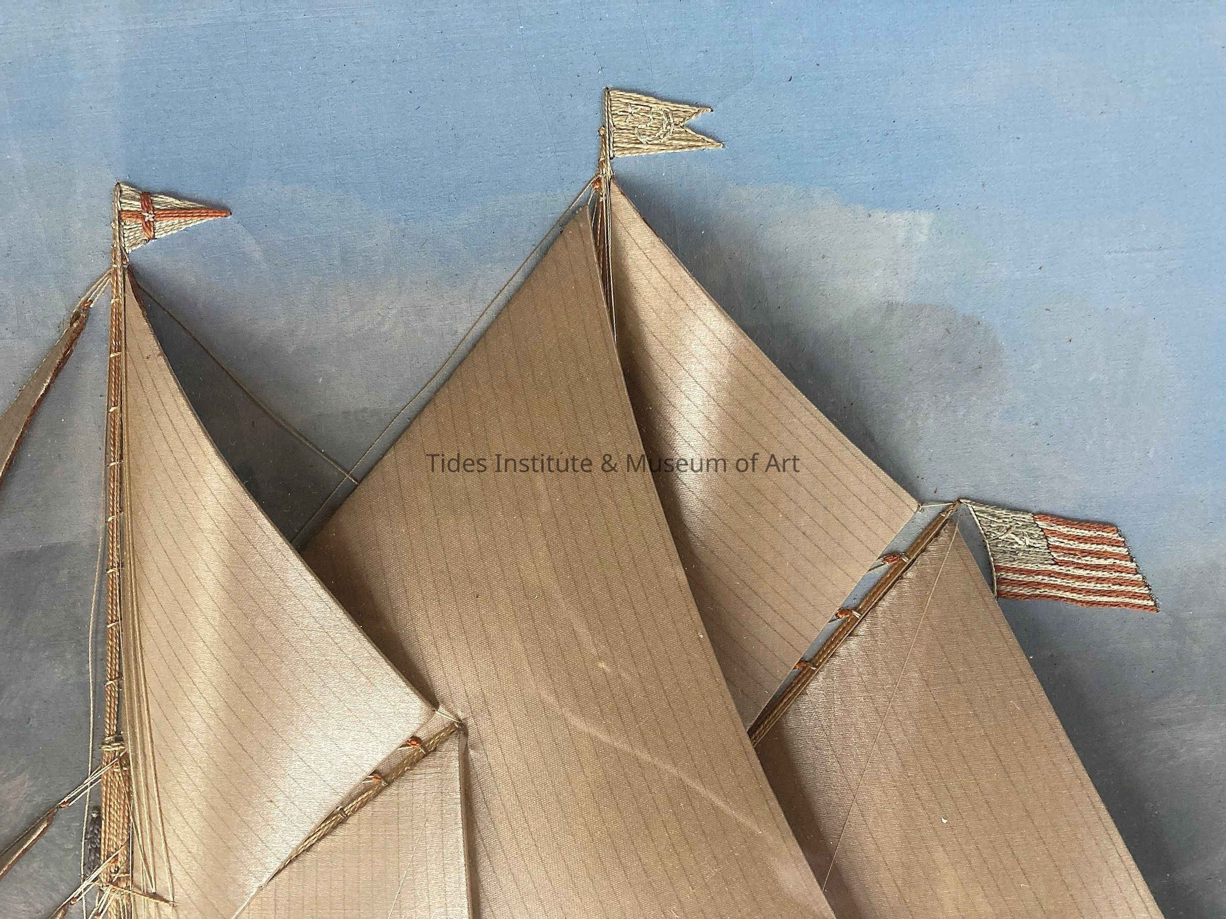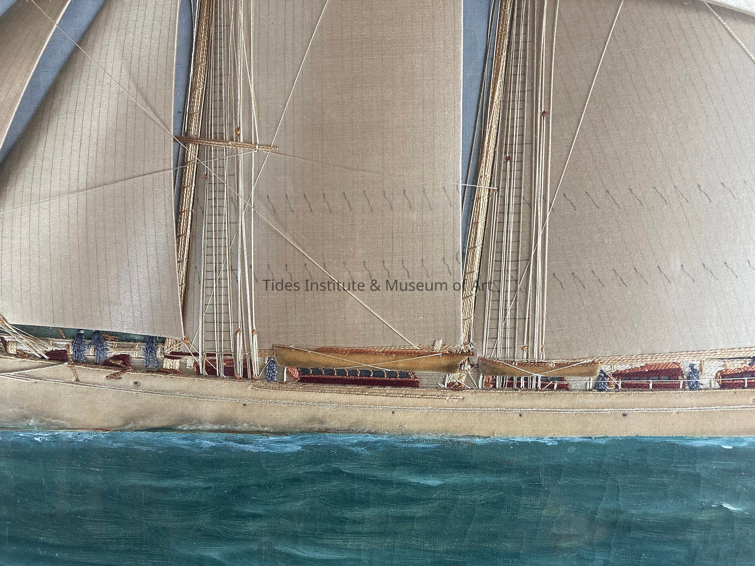 It is a combination of several "arts". Against an oil background, the bird-like vessel stands out in relief, her sails made of hand-carved thin wood, covered with white satin. Her penants are hand-embroidered thru the canvas. Her hull is fashioned of white velvet: her rigging of silk strands: her deck fittings done in scarlet, gold and shades of natural-wood. All hand-embroidered in heavy silk floss. Even the figures of her crew are painstakingly embroidered, stitch by stitch, by hand, in realistic poses, at work on deck and in the shrouds.