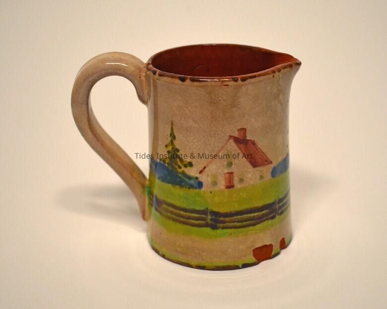 A pottery pitcher that was created as part of the Charlotte County Cottage Craft industry initiative founded in St. Andrews, New Brunswick by Grace Helen Mowat in 1913. It dates to the 1920s. Mowat was born in St. Andrews in 1875, studied art in London (Richmond School of Art and Music )and New York City (Cooper Union) and then briefly taught art in both New England and Nova Scotia. She then returned to St. Andrews to help care for her aging parents and their farm at Beech Hill. Then and there she came up with the idea of establishing a cottage craft industry the would help give employment and income to the rural women of Charlotte County, New Brunswick. Cottage Craft initially focused on yarns naturally dyed in colors reflective of Charlotte County landscape and seascape. The yarns were then sold directly as yarn or woven into products for sale such as sweaters and cardigans as well as colorful bags and figurative dolls. With the success of the yarn and weaving industry part of Cottage Craft, in the early 1920s Mowat next attempted to expand the industry by including linen and pottery. Neither proved to have longer term success after several shorter term attempts. The pottery that was produced using local clays and ranged from small vases and candle holders to small pitchers and plates, again, decorated in colors and scenes reflective of Charlotte County. With the coming of the second World War, Mowat’s oversight of Cottage Craft began to end and successors were found to continue the industry. Mowat died at her Beech Hill farm at the age of 90 in 1964.