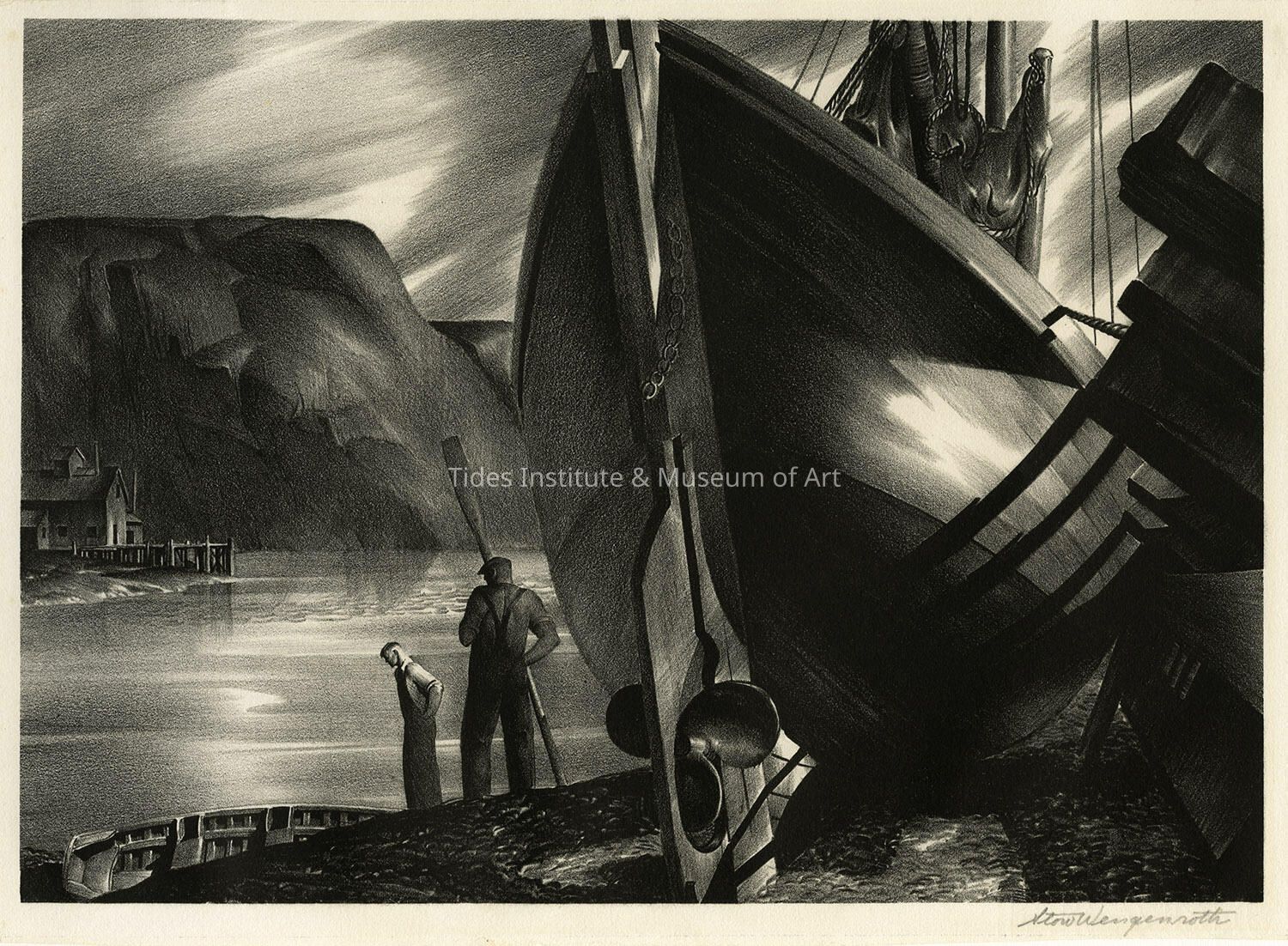 An original lithograph print, “Dark Harbor," by American artist and printmaker, Stow Wengenroth. It dates to 1932 and is likely of a scene on Grand Manan Island in New Brunswick. The print is one of 20 lithographs by Wengenroth of scenes of the Passamaquoddy region that the Tides Institute & Museum of Art has acquired for its collections over the past 18 years. Born in New York City in 1906, Wengenroth learned lithography in the later 1920s, early 1930s while a student at the summer art school based out of New York City that operated at Eastport from 1922 to 1936. He later taught at the summer school. From 1931 to 1933, he created 33 lithographs of scenes in the Passamaquoddy region, many are clearly Eastport, others, like “Dark Harbor,” look like Grand Manan. Wengenroth went on to have a long and successful career as an artist and printmaker. He died in 1978. In his early work in the area, Wengenroth produced some of his most imaginative and dramatic work. After his early period as an artist, he sort of settled down while continuing to produce a great many excellent and technically flawless works. Building a collection of Wengenroth’s works from the area has been part of the Tides Institute’s long term effort to rebuild some of the cultural legacy of this region, so much of which has been hidden, dispersed or seemingly lost. The Tides Institute’s current Wengenroth lithographs can be viewed online through the institute’s web based collections resource: http://www.tidesinstitute.org/place/browseArt.php?collection=22. The Tides Institute hopes to secure the remaining 13 Wengenroth prints of the region for its collections over the next decade and to mount an exhibition of its Wengenroth lithographs.