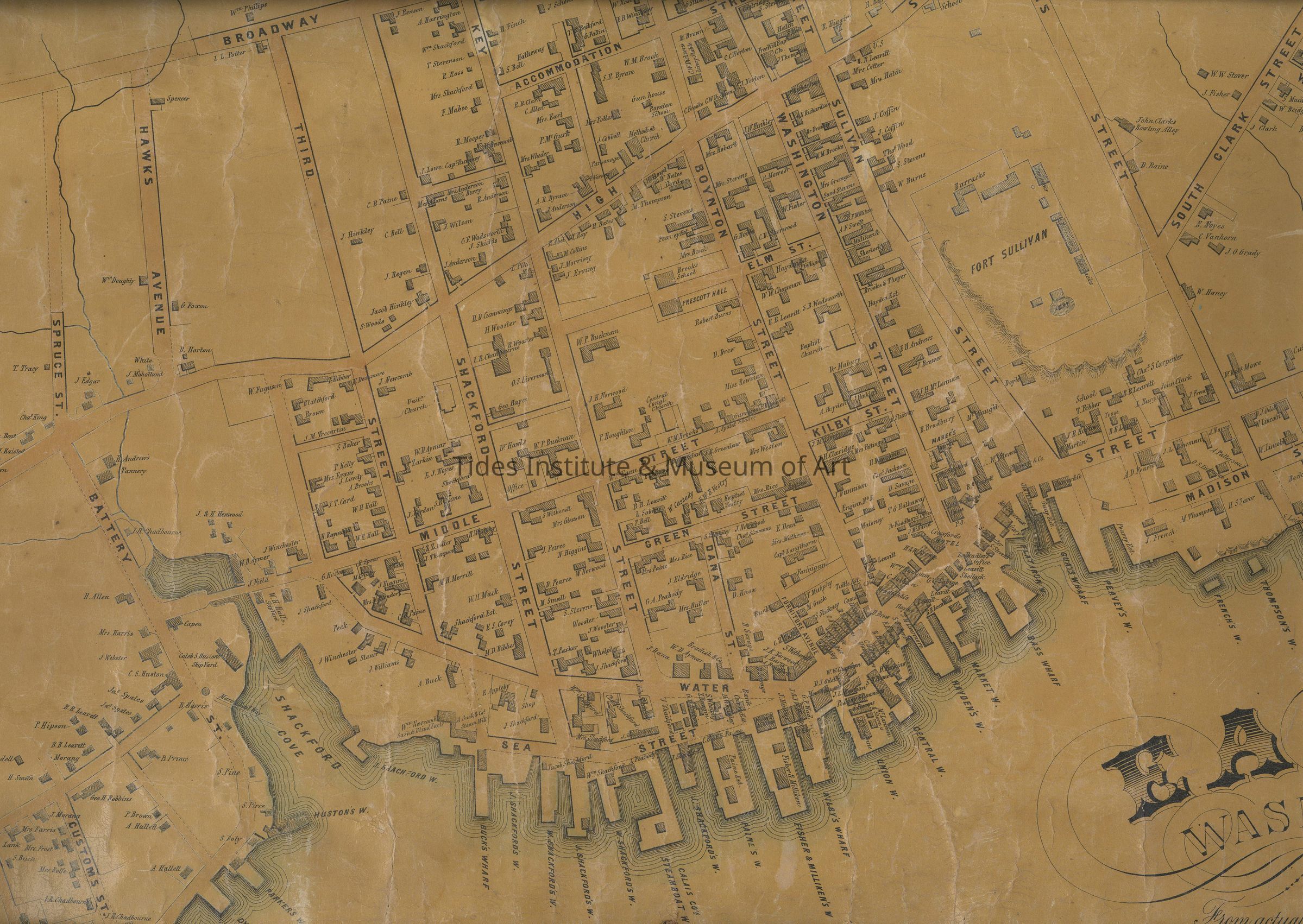 Detail from Map of the Town of Eastport Washington Co. Maine, From Actual Survey by D.S. Osborn, Civil Engineer; Published by E.M. Woodford, N.E. Cor. 4th & Chestnut Streets, Philadelphia, 1855. Printed by Wagner & McGuigan.