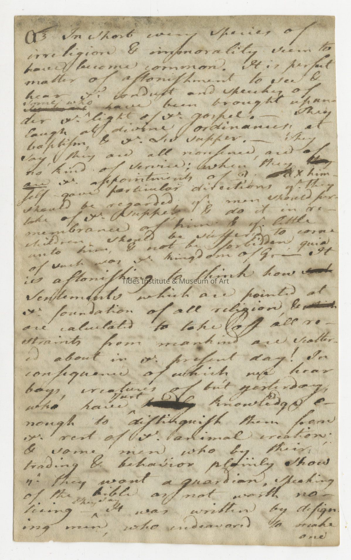 In short every species of irreligion and immorality seem to have become common. It is (a) perfect matter of astonishment to see and hear that conduct… and speaking of some who have been brought up under the light of the gospel. They laugh at divine ordinances, at baptism, and the lord's supper. They say, they and all … are of no kind of service; when they are the appointments of God himself gave particular directions that they should be regarded and men should partake of the supper and do it in remembrance of him and the little children should be suffered to come unto him and not be forbidden … of such was the kingdom of God. It is astonishing to think how sentiments which are pointed at the foundation of all religion, and are calculated to take off all restraints from mankind are scattered about in the present day! In consequence of which we hear boys, creatures of but yesterday who have just knowledge enough to distinguish them from the rest of the animal creation and some men who by their trading and behavior can plainly show they want a guardian speaking of the bible as not worth noticing they say it was written by designing men who endeavored to make (end of page 1)