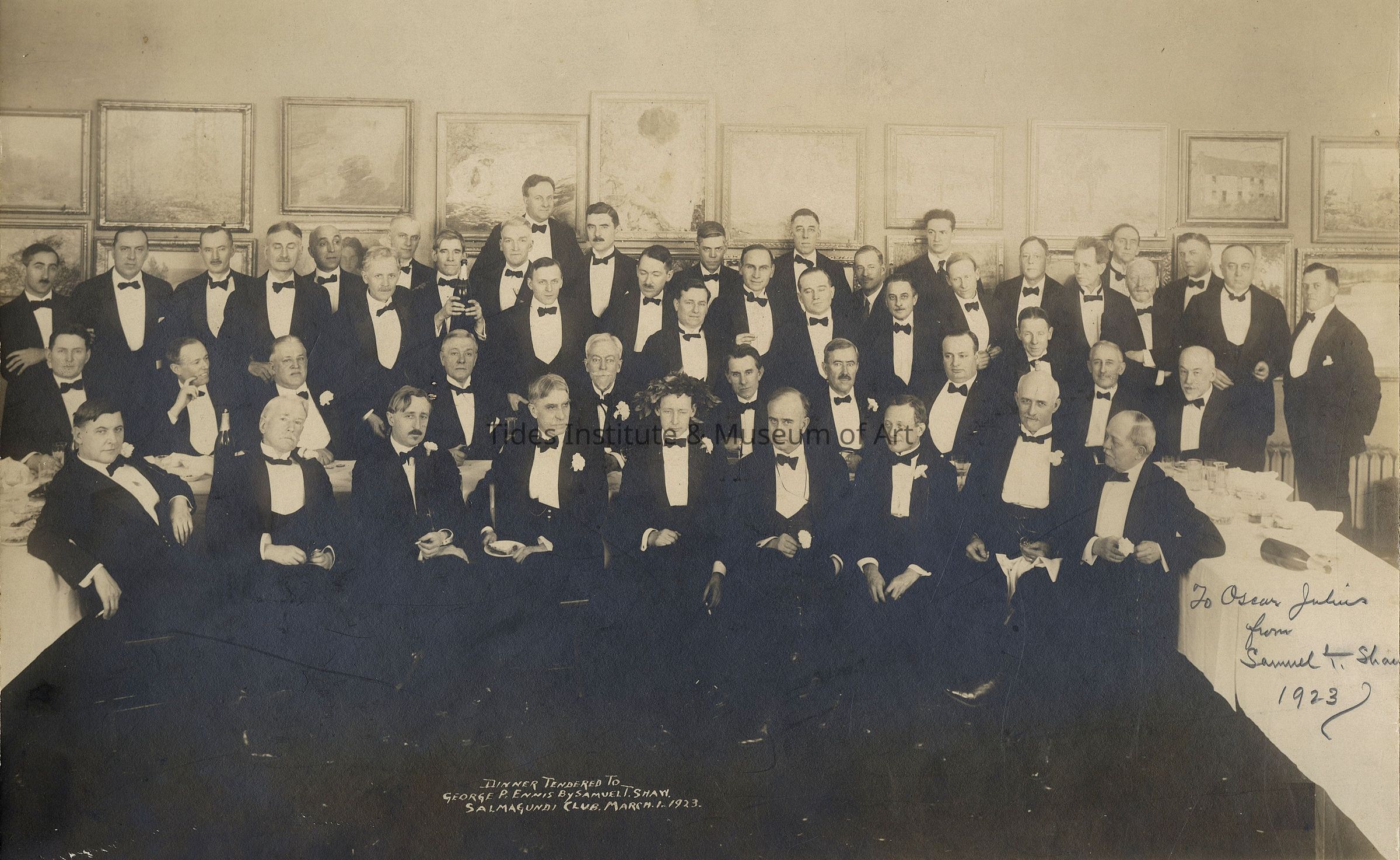 Dinner Tendered to George P. Ennis by Samuel T. Shaw, Salmagundi Club, March 1, 1923 | Photograph | Inscribed to Oscar Julius from Samuel T. Shaw, 1923