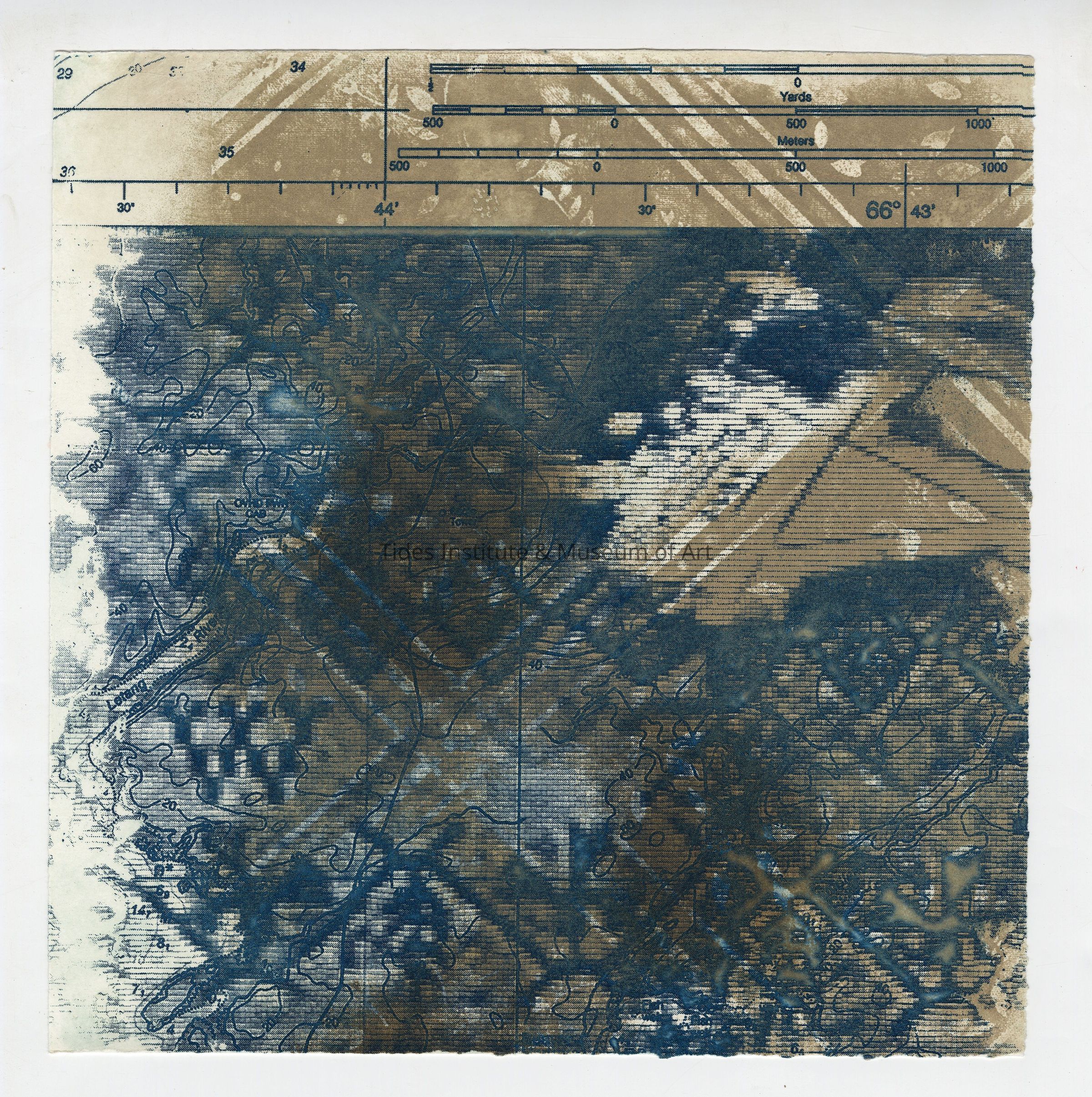 Lydia Nieuwenkamp (intaglio) – The two textiles I have found in my research interweave the topographical lines in the map with the patterns found in the fabrics. e worn appearance of the textiles refers to the lost and abandoned landscape of the region.