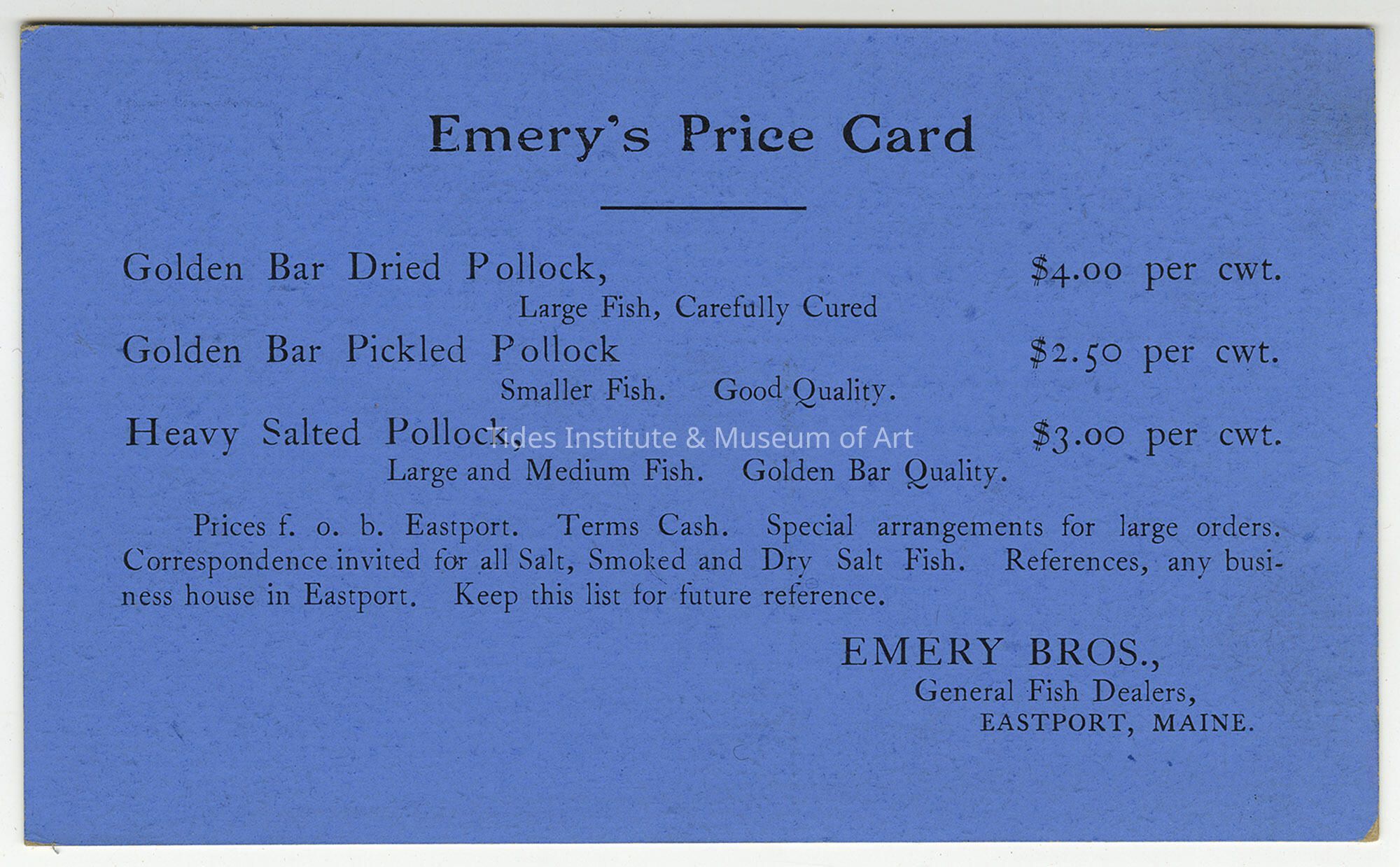 Old Accession Number: 1796 Description: Emery Brothers, General Fish Dealers, Eastport, Maine