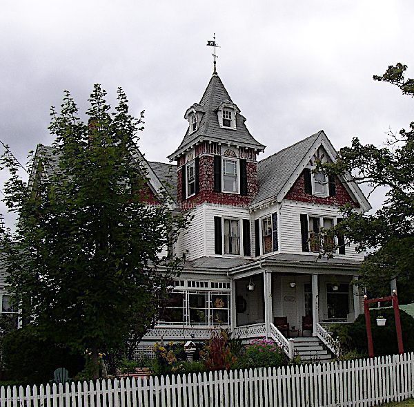 Everett Wallace was the original owner of this Victorian home on Route One. Mr. Wallace operated a general store in Milbridge. His home burned to the ground around 1920, and Mr. Wallace had it rebuilt exactly as it was before. This Queen Anne Victorian has decorative shingles, pointed tower, and gabled roof with cross gable winds. Today it is the Moonraker Bed and Breakfast, owned by Mr. and Mrs. William Handrahan. TH