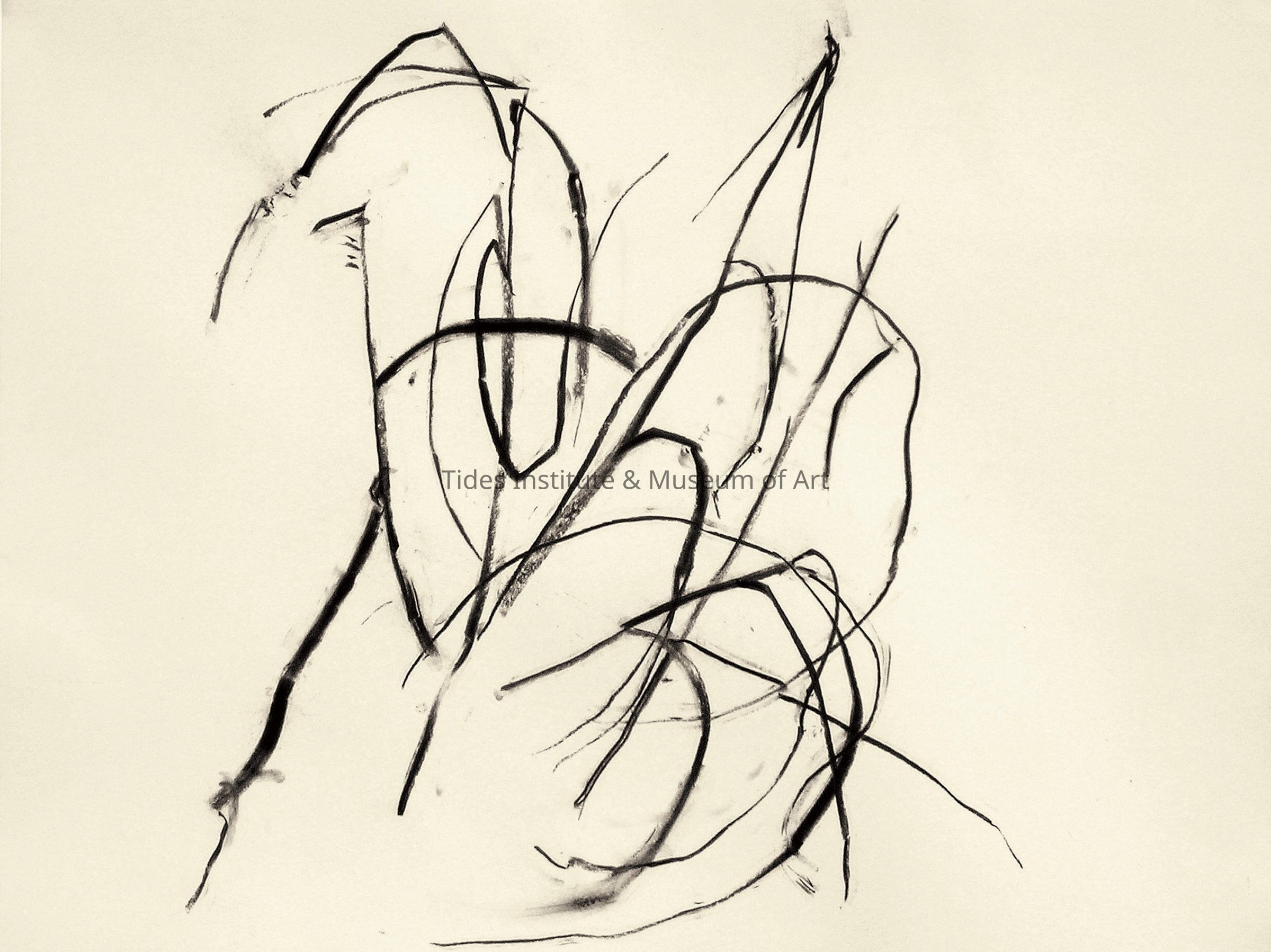 A large contemporary charcoal drawing, “February 17, 2006 #1 Winter Grass," by artist, Susan Hartnett. Born in 1940 in St. Louis, Missouri, for many years Hartnett has lived part of the year on the eastern coast of Maine. The rest of the year she spends in New York City where she has lived for much of her working life. But it is along the eastern coast of Maine and surrounding area that she is able to find plentiful subject matter for her expressive drawings of grasses. She has done hundreds of such drawings, each unique, each capturing subtle and larger differences in type and form of grasses that change with the weather and with the season. Her work has an immediacy as she works deliberately to capture grasses in her drawings, each stroke adding to the previous, with a minimum of strokes used, fluid yet purposeful. The use of charcoal allows her to quickly adjust her line, from thick to thin, from dense to light, from clean to smudge. Asian as well as western aesthetic traditions have influenced her work. She writes, “A lot of knowledge of Chinese and Japanese ink painting and calligraphy had to be thoroughly assimilated before the "stroke" could be applied. Large leaves need a supple brush, whereas grass or twigs could be done with strokes of different thicknesses of charcoal. I've made charcoal supple.” This particular drawing was a gift to the Tides Institute by the artist.