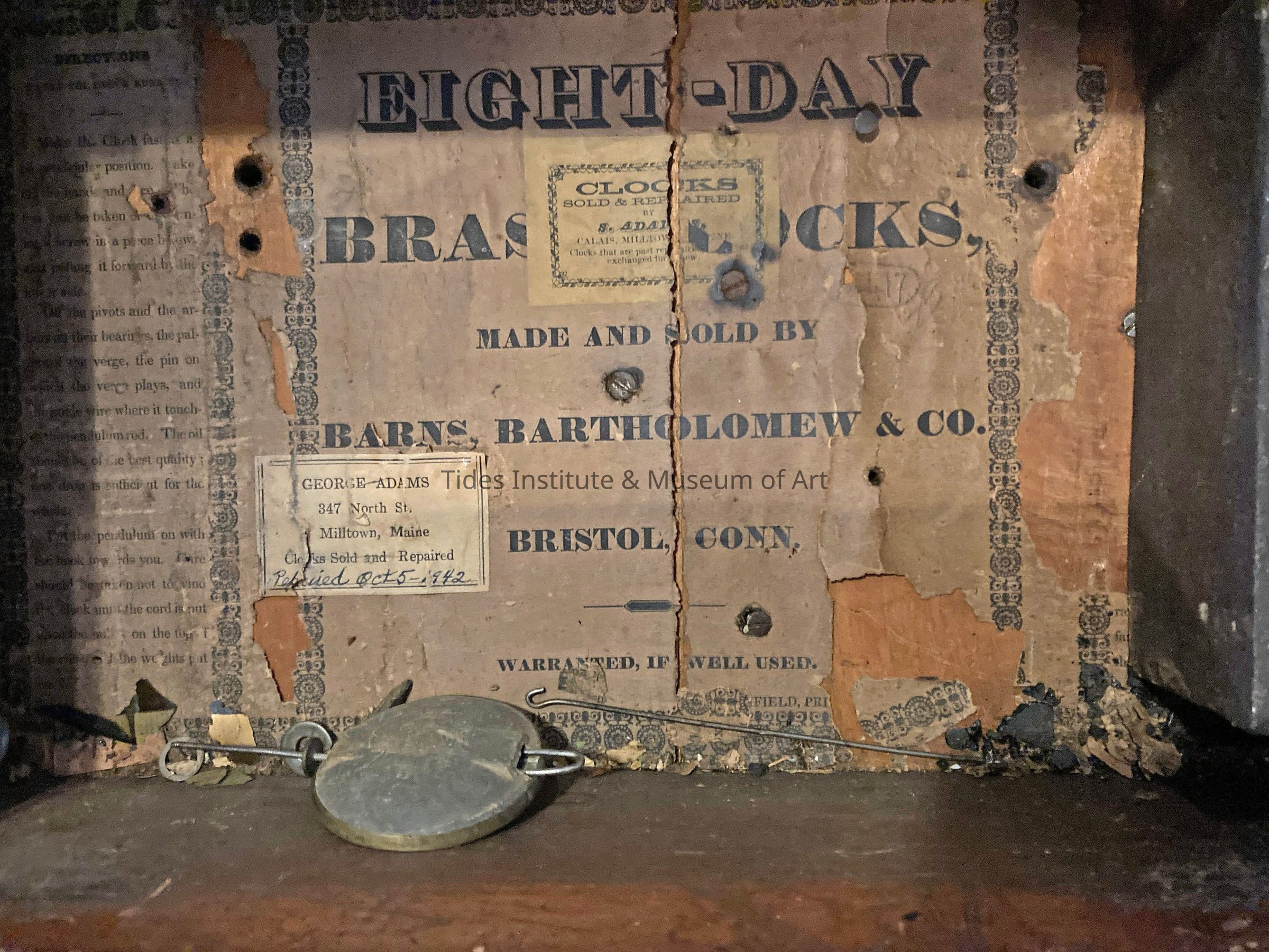 As you can see from the pictures, it is an eight-day clock. However, it is not operated by springs. The weight on the extreme right of the picture with the door open is very heavy. The label to the left of the pendulum, states that it was repaired in Calais Maine October 5, 1942. The label above the pendulum, partly obscuring the words Brass Clocks, indicates that it was sold by S. Adams, Calais/Milltown, Maine. (The first label showed that it was repaired by George Adams.)