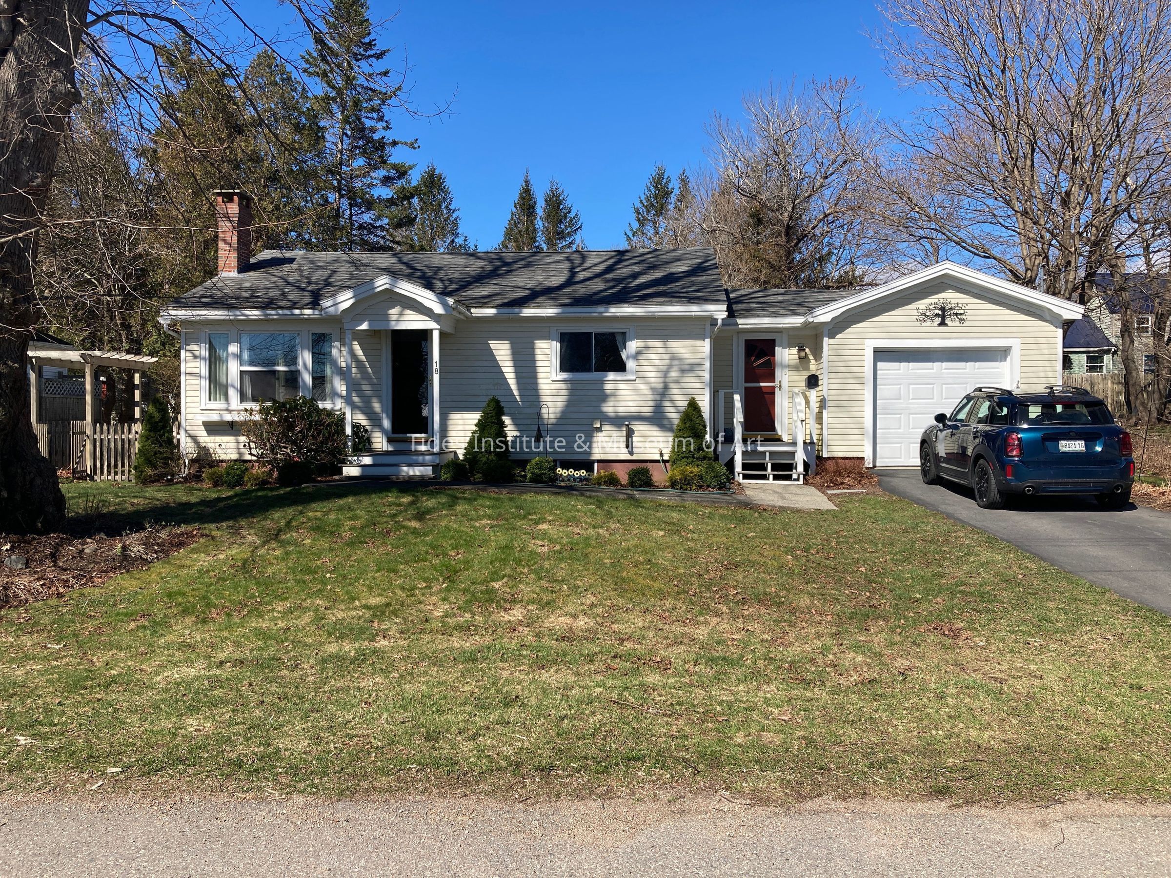 This one story wood frame ranch style house dates to about 1950. It has a three bay front with center doorway and an attached garage.