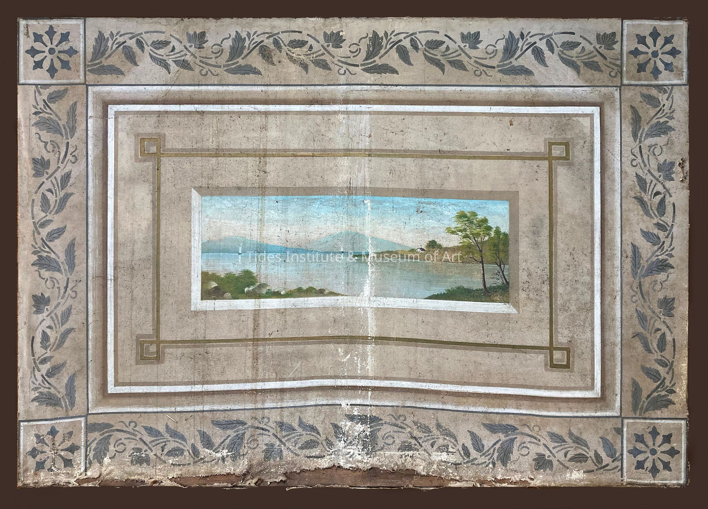 Fireplace Screen. Painted canvas landscape scene with decorative stenciled scrollwork border mounted on wood frame. 50 inches wide and 35 inches high. Date: c.1870. From Grady house, 1 Adams Street, Eastport, Maine.