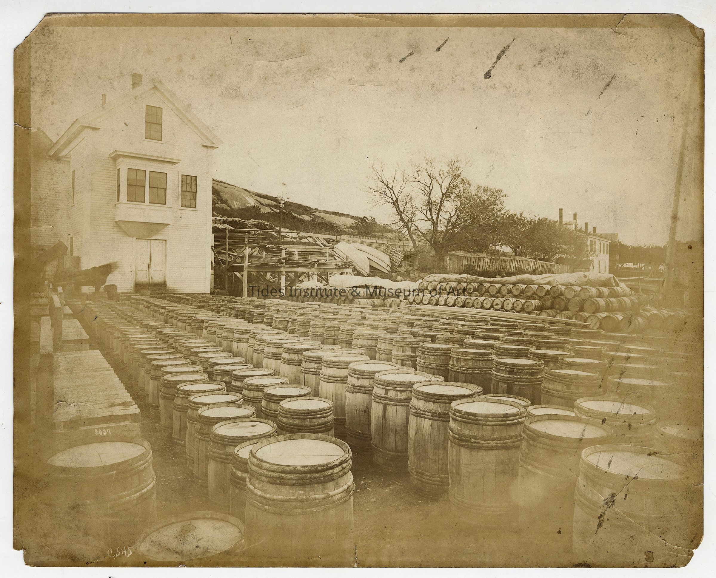 Fish Wharf Showing Barrels of Mackerel, Gloucester, MassachusettsDescription
