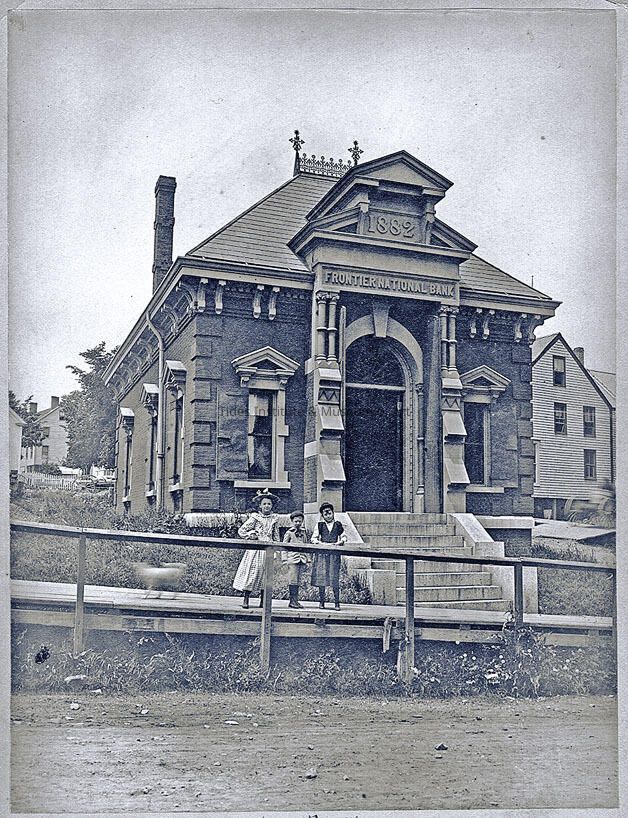 30) Frontier National Bank (NR) 30 Water St. The history of the Frontier Bank goes back to 1836 when it was at the foot of Washington street and was considered a state bank. In 1882 the Frontier National Bank built its brick building at the corner of Dana and Water Streets. Although the exterior survived the 1886 fire, the roof and interior were destroyed.