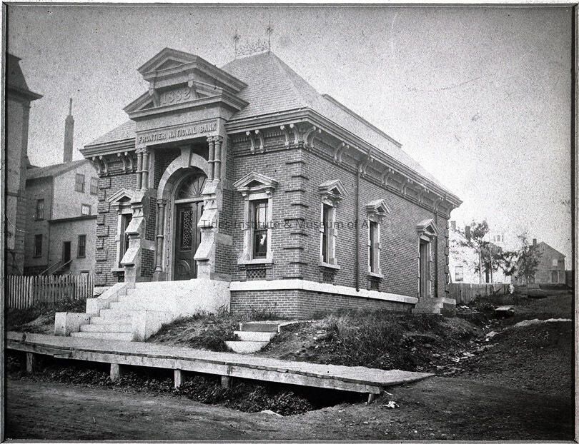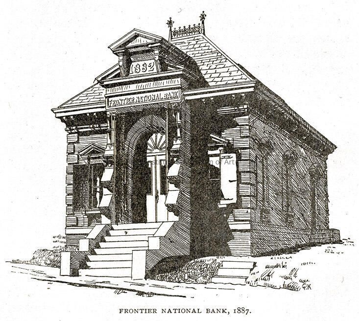 June 6, 1883: The Frontier National Bank is now occupying its new building and the Cashier and Assistant are happier and more obligin g than ever in their comfortable and cosy quarters. The inside of the building is handsomely finished in cherry, which with the tastefully tinted walls and colored glass windows and doors produces a pleasing effect. The interior woodwork placed in by E.E. Newcomb and the painting and fitting by Messrs. Harrington and Campbell are excellent specimens of workmanship.·The floor of the Director's room and entry are composed of squares of different kinds of hardwoods with neat borders surrounding them and are handsome pieces of work. The arrangement s for the convenience of the business of the bank are excellent. A roomy space with tiled floor and well-lighted is afforded for the customers of the bank, while inside of the counter, which ha s a high ornamental wire railing reaching nearly to the ceiling, is the vault and Director's room. One of the Hall's latest improved burglar-proof safes is enclosed in the vault, which is of course fire-proof, making the securities of the bank and those deposited there both fire and burglar proof. There are several steel chests within the safe for the use of private parties. The exterior of the building hs been before described, being composed of brick with heavy granite facings, of a handsome and novel style of architecture, making it ornamental to our town and a building that will outlive us and our children.