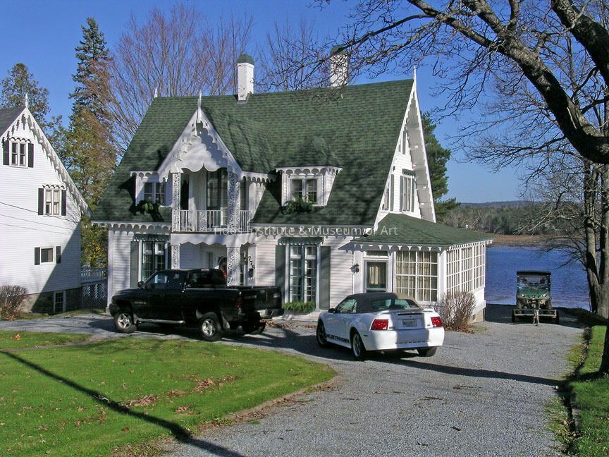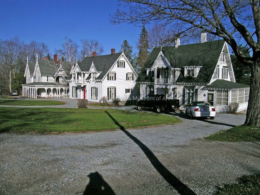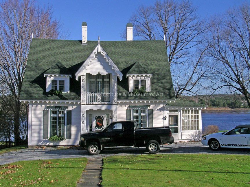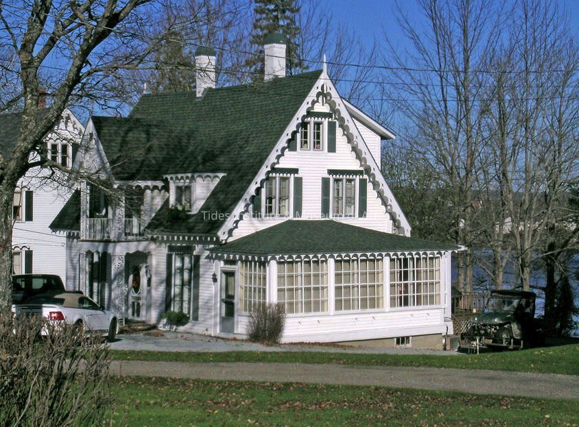 This Carpenter Gothic House at 318 Main Street was built in 1855 by George Washburn. It also had decorative bargeboards and gingerbread ornamentation of the window lintels. The doorway has a semi-elliptical fan, sidelights, and is flanked by pilasters. The balcony on the centerfront of the second story has an ornamental balustrade, decorative woodwork, and a finial its gable peak:. The barn behind the house was removed in 1938, and a porch was added in 1947. The porch was enclosed as a den in 1962. A gable roof, punctuated by two brick chimneys~ connecting the interior, crowns this 1 112 story wooden frame residence with